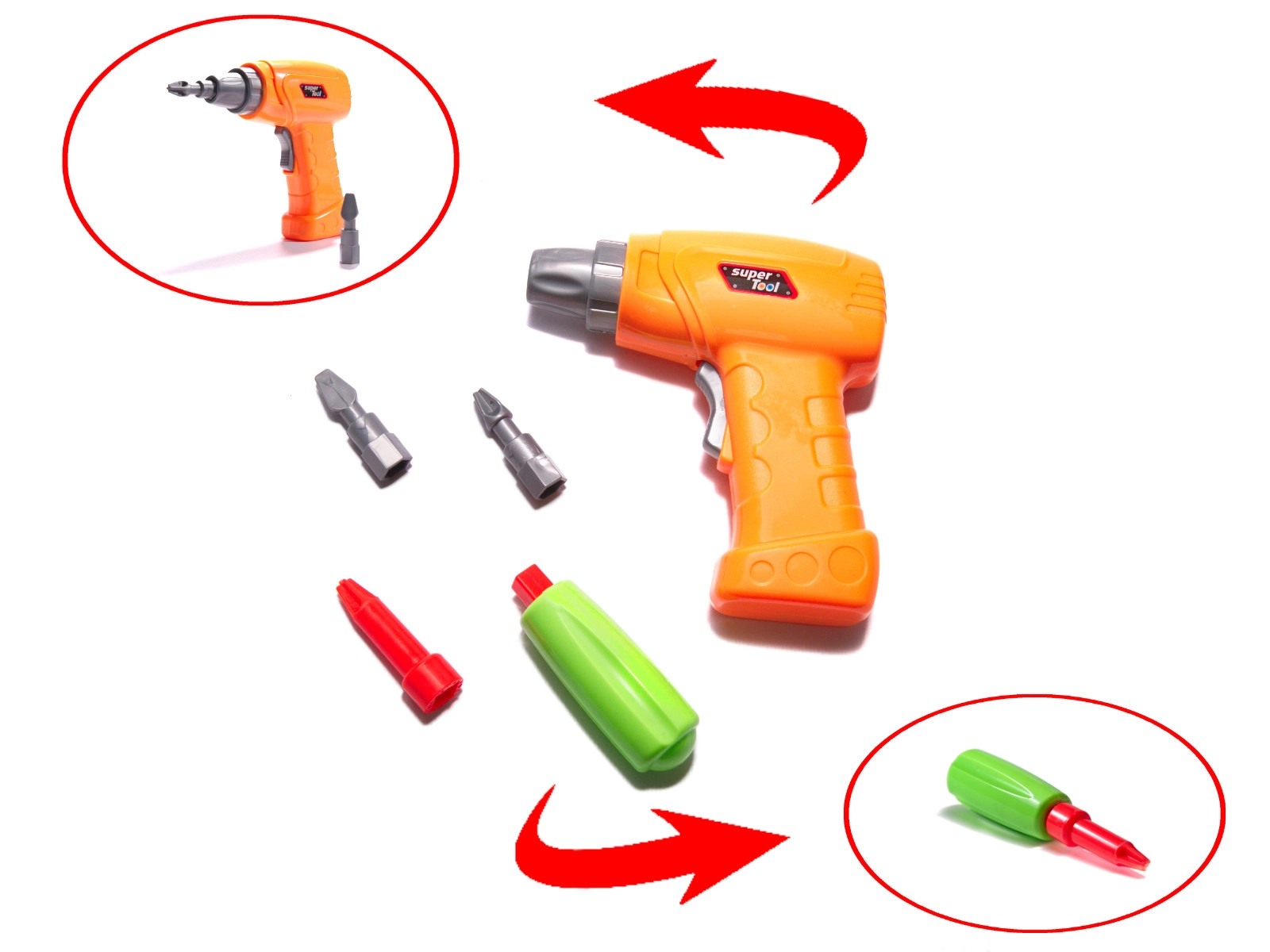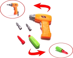 Plastikinis grąžtas su keičiamaise antgaliais ir realistiškais garsais autentiškam žaidimui.