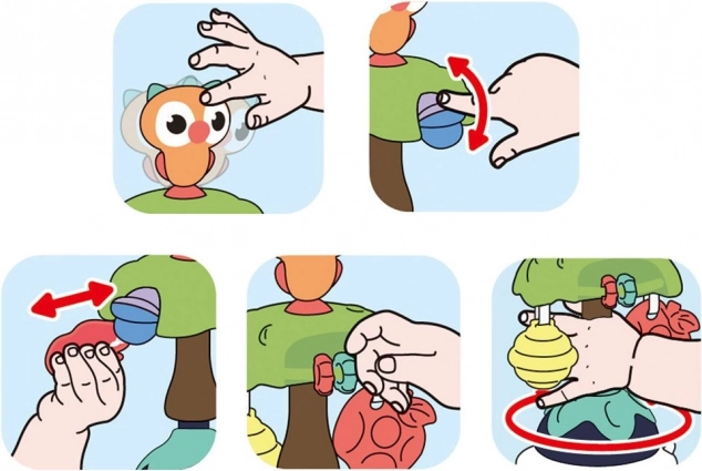 Spalvingos ir judančios žaislo dalys skatina vaikų sensorinę ir motorinę raidą.