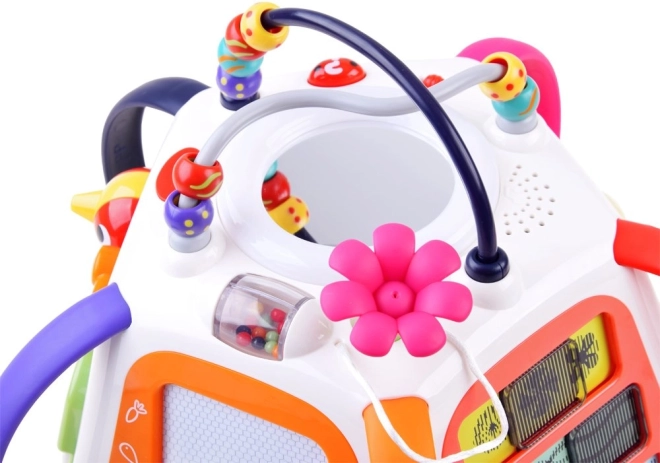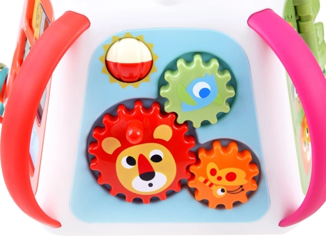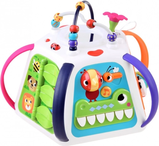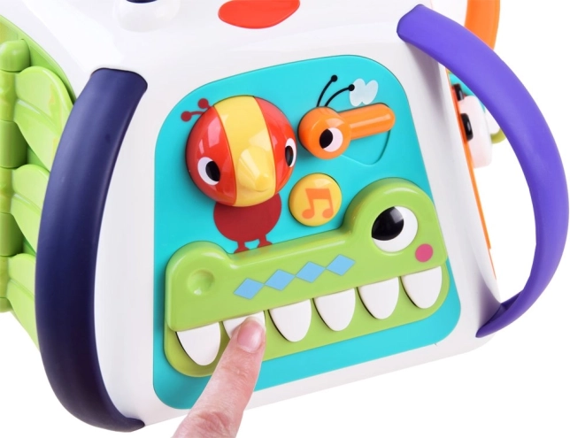 Įjungus kubą, pasigirsta melodijos, garso efektai ir šviesos, kurios skatina vaikus toliau tyrinėti. Taip pat yra pianinas krokodilo dantukų pavidalu, judantys elementai, slankiojantys skydeliai su optiniu „gyvos“ animacijos efektu ir saugus veidrodėlis.
