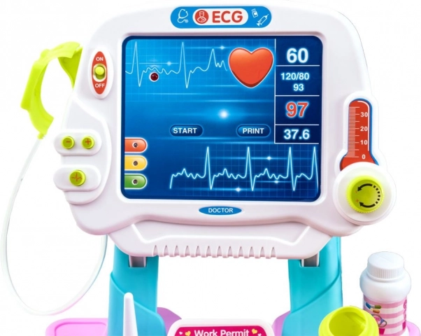 Interaktyvus skydelis su efektais (šviesos ir garsai) imituoja paciento stebėjimą, o funkciniai elementai, tokie kaip „mirksinti širdutė“ stetoskope ar apšviestos reikšmės termometre ir tonometre, dar labiau įtraukia į žaidimą. Vežimėlis su ratukais leidžia lengvai pervežti visą rinkinį.