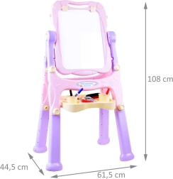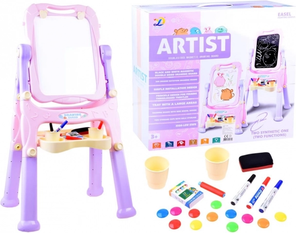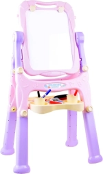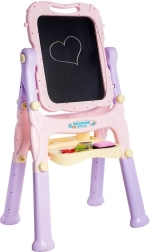 Ši spalvinga dvipusė lenta siūlo viską mažiesiems menininkams: juodoje pusėje galima rašyti kreida, balta magnetinė pusė tinka sausai nuvalomiems markeriams, magnetukams arba prisegtiems popieriaus lapams piešti. Patogi lentynėlė ir puodeliai leidžia kreidas, markerus ir teptukus laikyti visada po ranka.