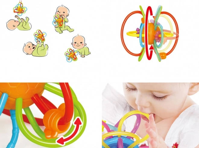 Šis kūrybiškas „kamuolys“ su susipynusiomis kilpomis ir karoliukais sukurtas natūraliai žadinti vaiko pojūčius. Elastingos ir lanksčios kilpos maloniai laikosi net pačiose mažiausiose rankytėse, o glotnus, minkštas paviršius švelniai masažuoja dantenas. Slankiojantys karoliukai ir lengvas barškėjimas lavina klausą ir dėmesio sutelkimą.
