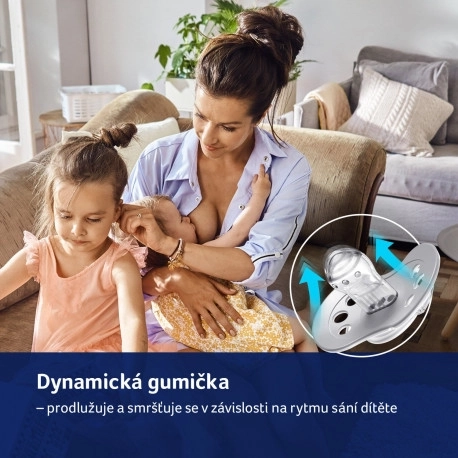Nesperforuota daugiasluoksnė konstrukcija natūraliai susispaudžia ir išsiplečia žindimo metu, imituoja spenelį ir padeda formuoti sveikus burnos įpročius.