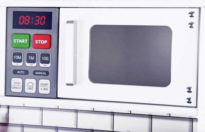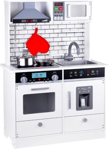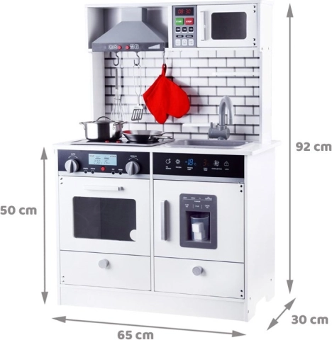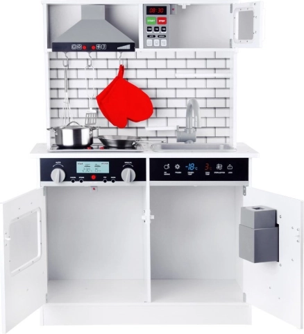 Ši graži medinė virtuvėlė aprūpinta visais reikalingais prietaisais, kurie leis vaikams „gaminti“ skaniausius patiekalus. Baltas koloritas su moderniomis plytelėmis puikiai derės bet kuriame vaiko kambaryje ar virtuvės kampelyje.