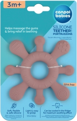 Įvairios tekstūros ir iškilimai aplink visą kraštą ramina sudirgusias dantenas ir padeda dygstant pirmiesiems dantukams.