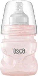 Ergonomiškai profiliuota buteliuko forma palengvina laikymą ir maitinimą saugioje padėtyje. Buteliukas be BPA, tinkamas nuo gimimo ir suderinamas su LOVI pientraukiais. Dėl plačios angos lengva pripildyti ir valyti. Pakuotėje rasite taip pat elastinį sandarinimo diską saugiam pieno laikymui, dangtelį ir matuoklę su specialiu snapeliu tiksliam dozavimui.