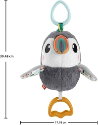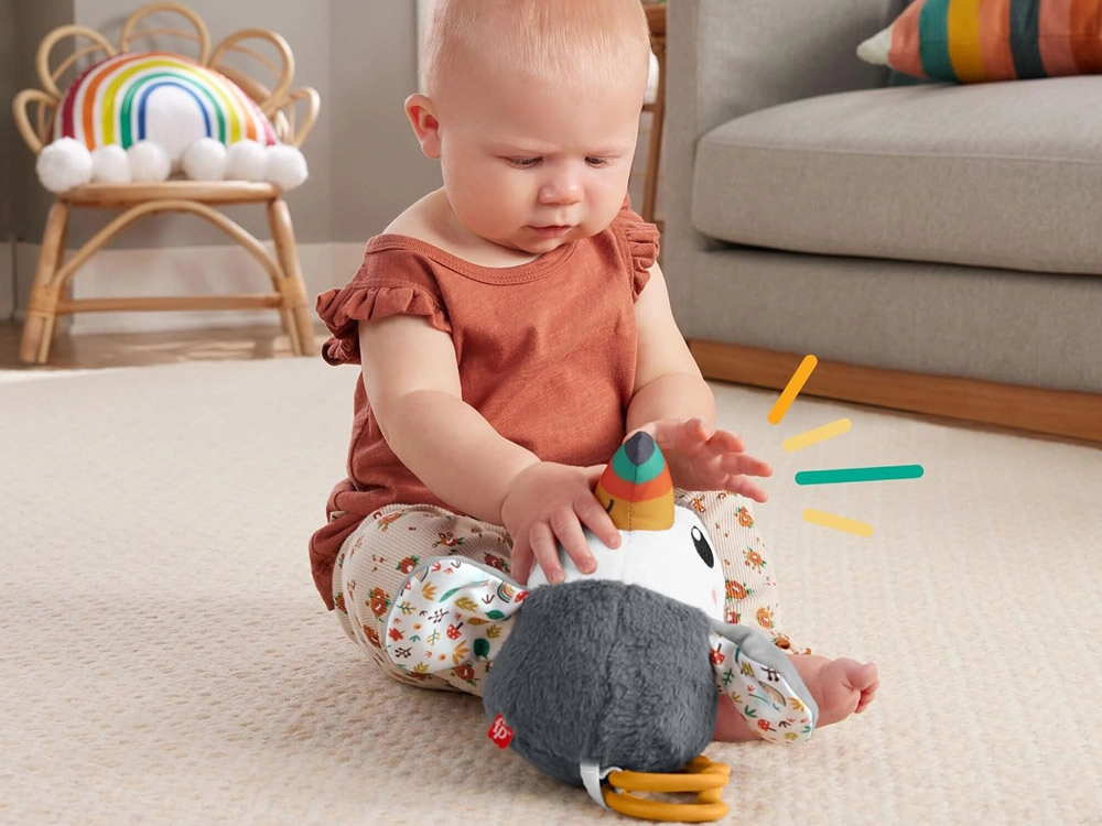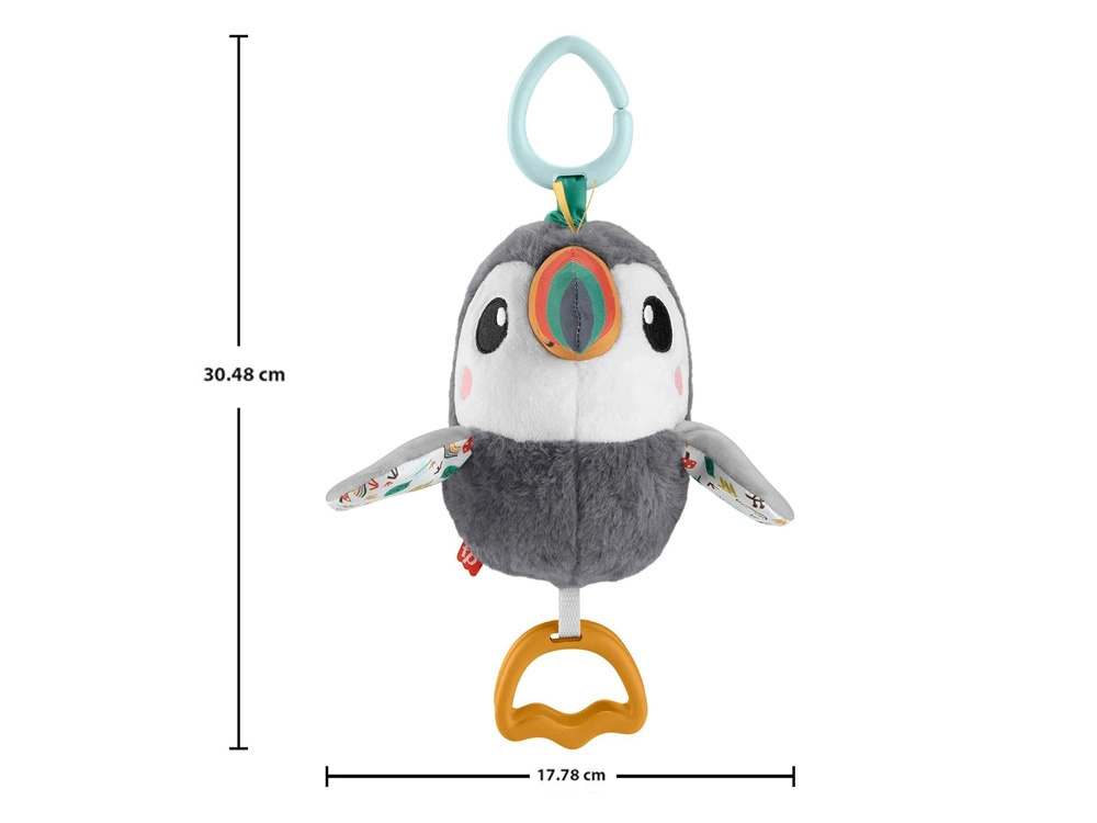 Mielas Fisher‑Price tukanas – minkštas pakabinamas žaislas vežimėliui, autokėdutei ar lovytei. Jis siūlo švelnų barškėjimą, šiugždančius sparnelius, spalvingą snapelį ir kandimo žiedus, padedančius dygstant dantukams. Dėl universalaus segtuko žaislas visada po ranka ir skatina kūdikio nuo gimimo jutiminį vystymąsi bei smulkiąją motoriką.