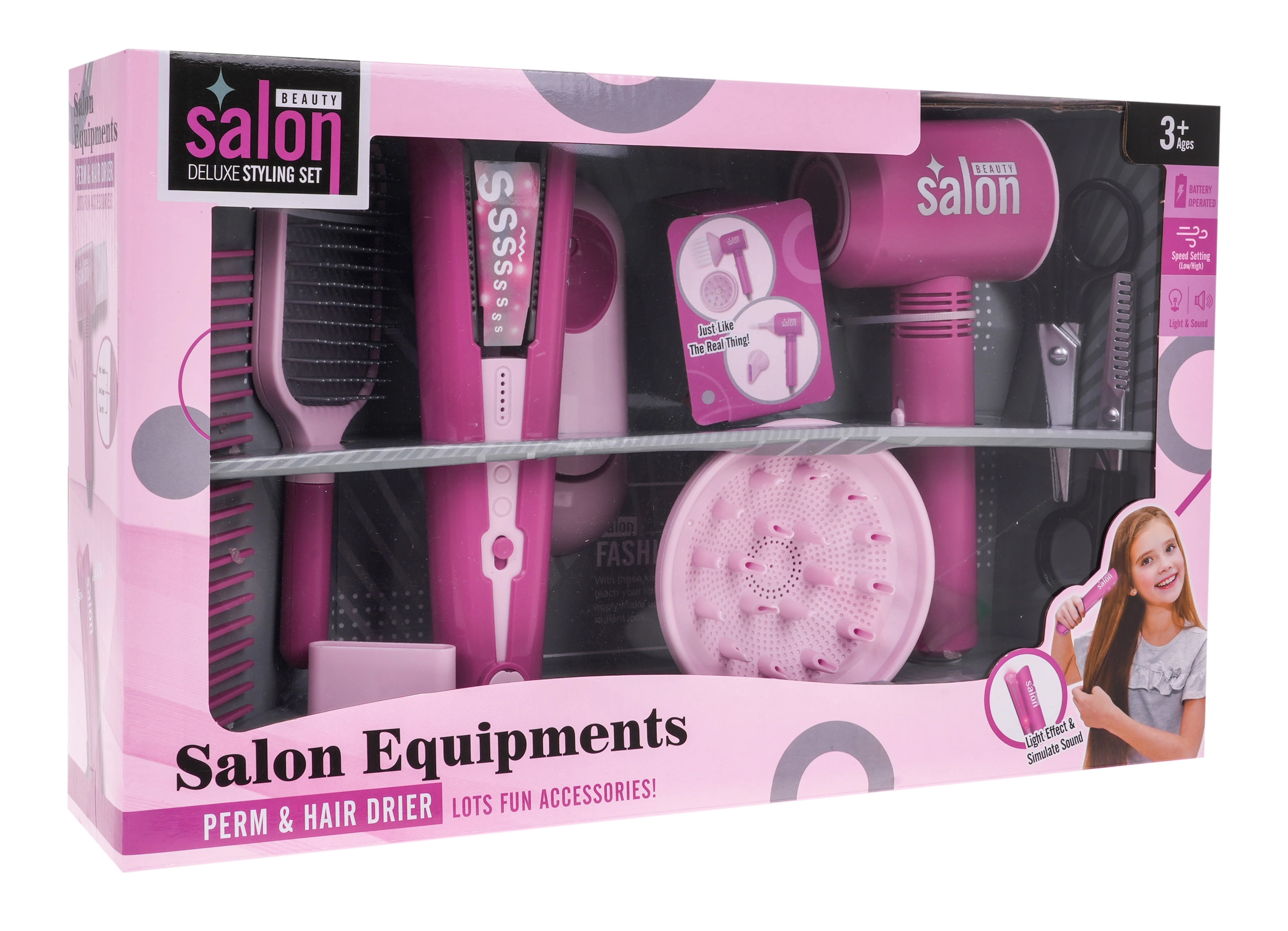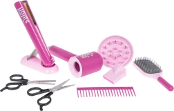 Atraskite linksmą vaikišką kirpėjo rinkinį mažiesiems stilistams nuo 3 metų. Rinkinyje yra veikiantis, baterijomis maitinamas fenas su keičiamais antgaliais ir plaukų tiesintuvas su šviesa ir garsu. Komplektą papildo gausūs priedai: žirklės, šukos, šepetys ir stovelis. Fenas pučia orą, turi 2 galios lygius ir skleidžia realius džiovinimo garsus. Tiesintuvas su šviesos efektais ir garsais suteikia dar daugiau autentiškumo kirpyklos žaidimams.