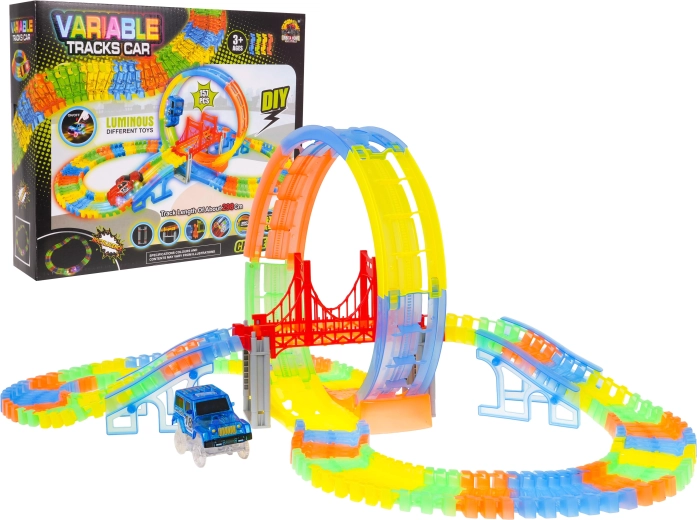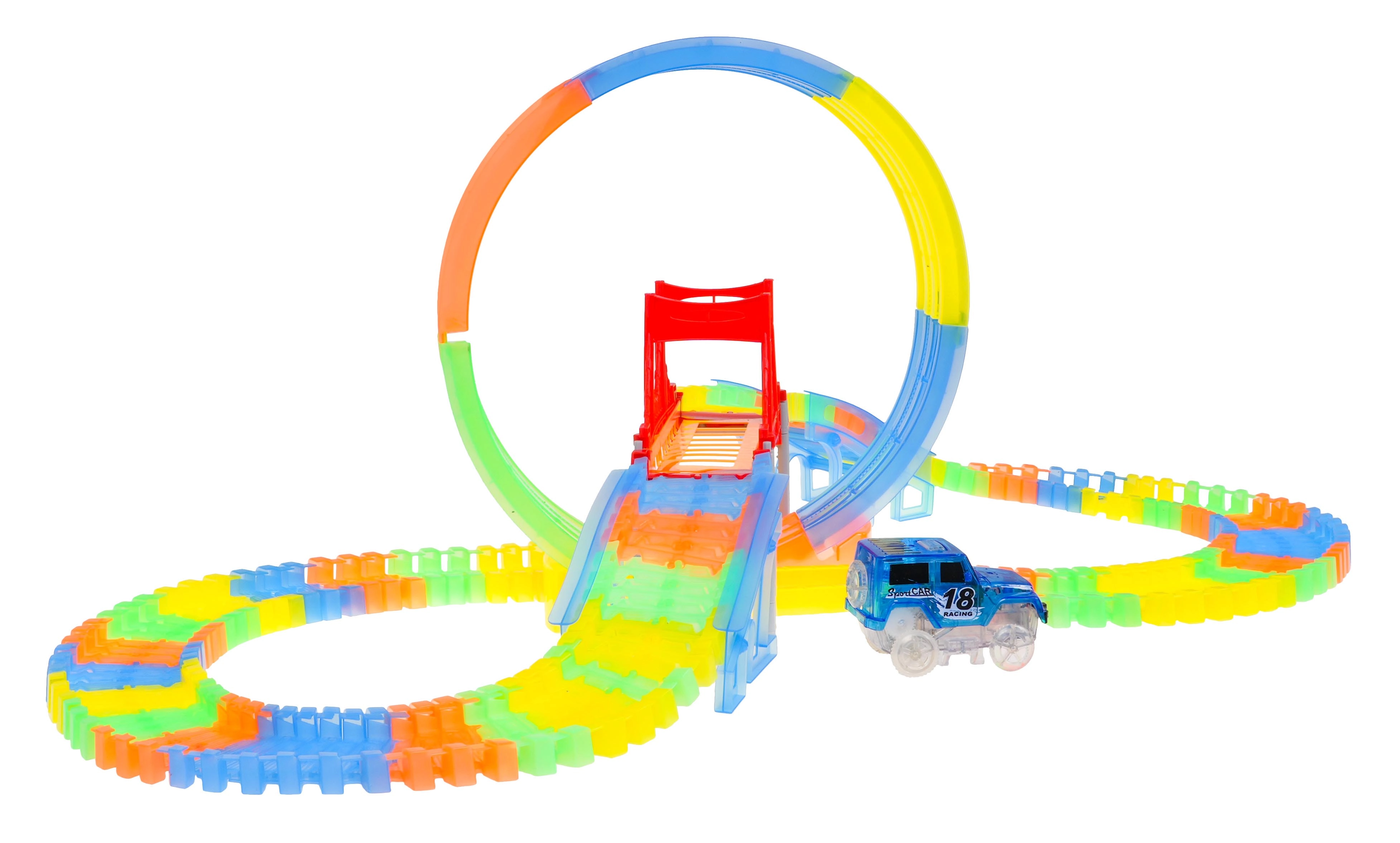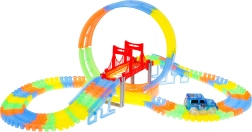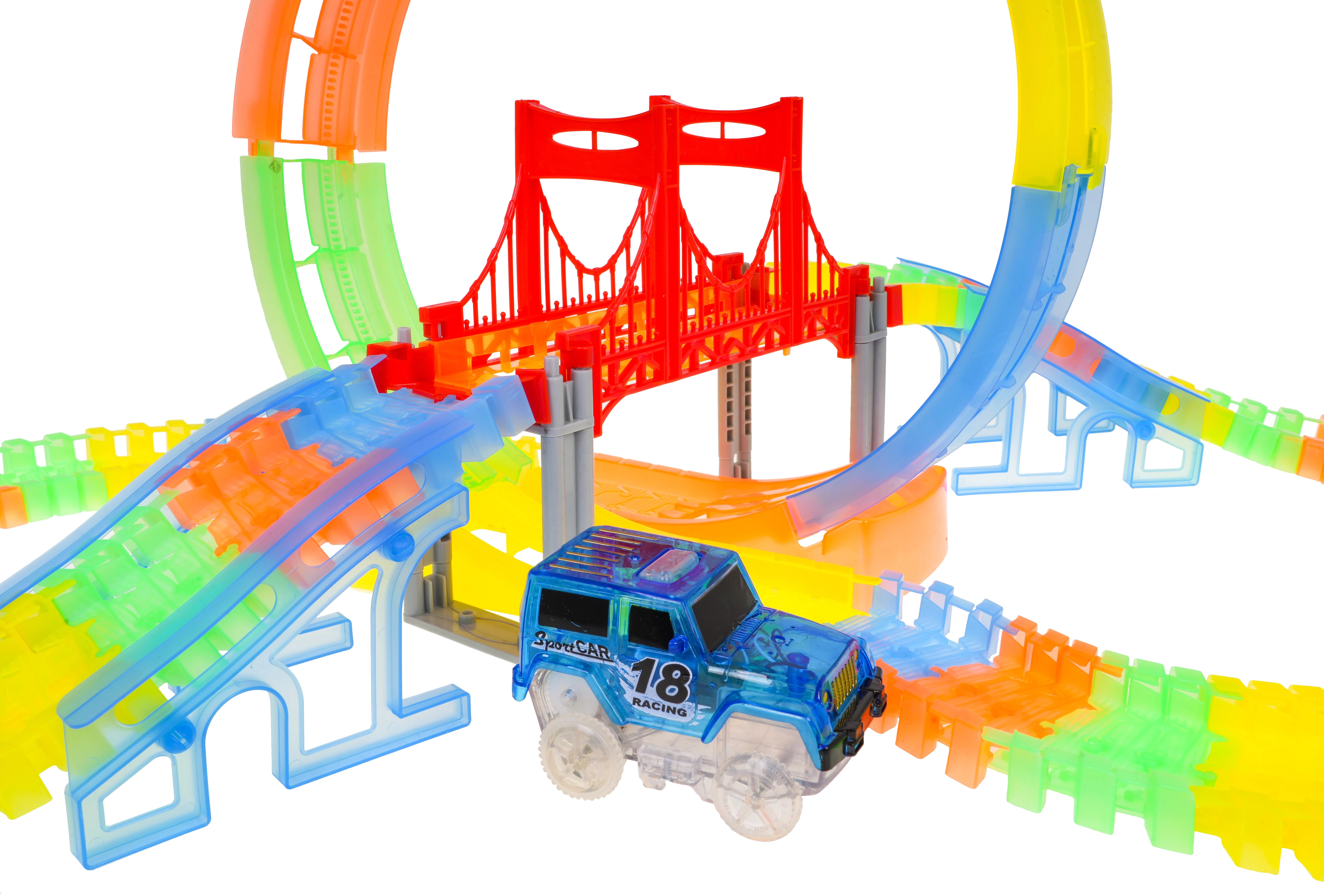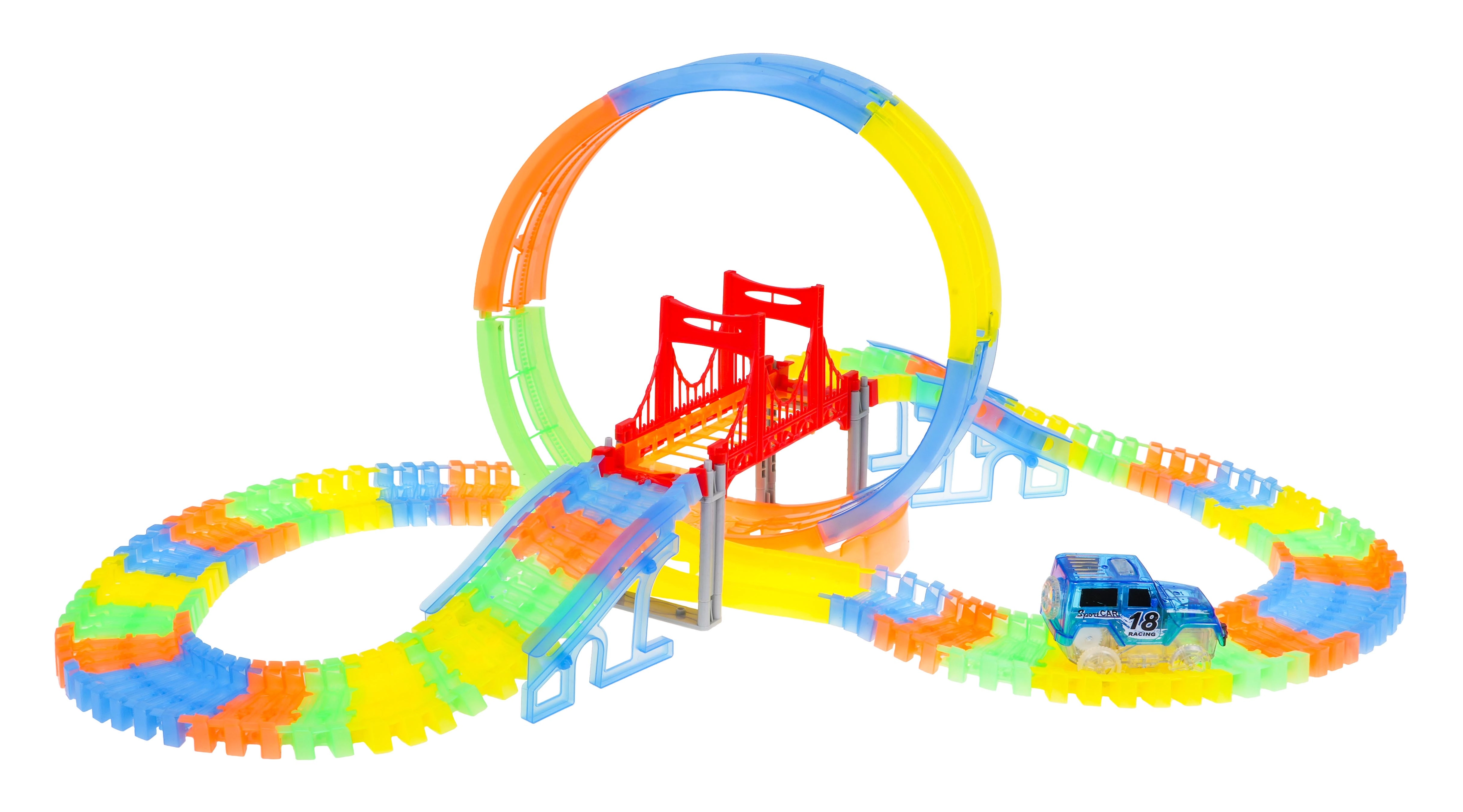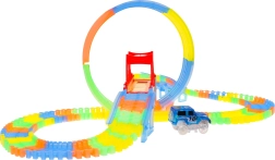 Ši spalvinga lenktynių trasa švyti tamsoje dėl fluorescencinių dalių ir komplekte esančio LED automobilio. Dalys paprastai susijungia, jas galima sukti, kelti ir pergrupuoti net važiavimo metu, kuriant naujas trasas su 360° kilpa, tiltais ir rampomis. Tereikia paspausti mygtuką ant automobilio stogo ir lenktynės gali prasidėti!