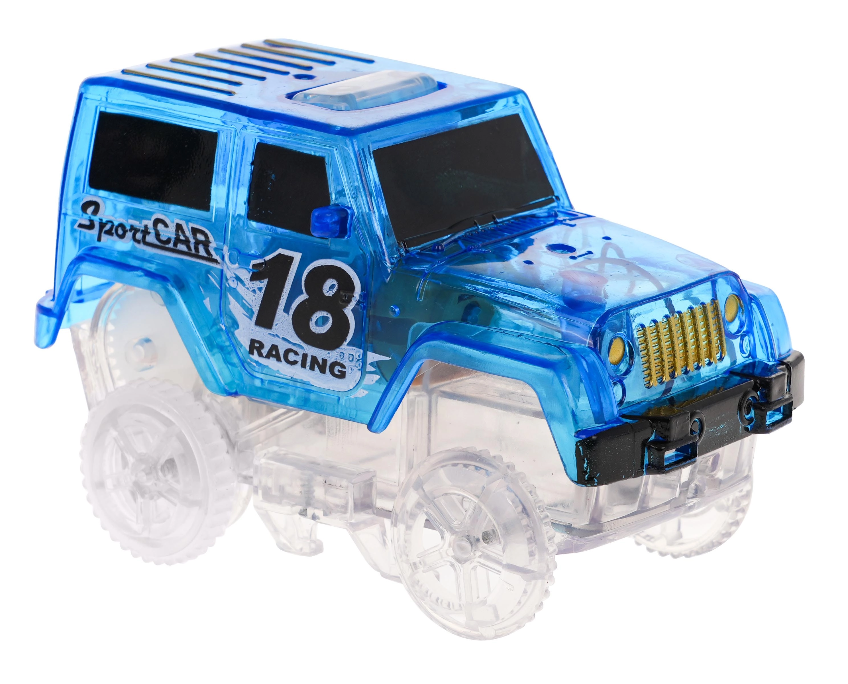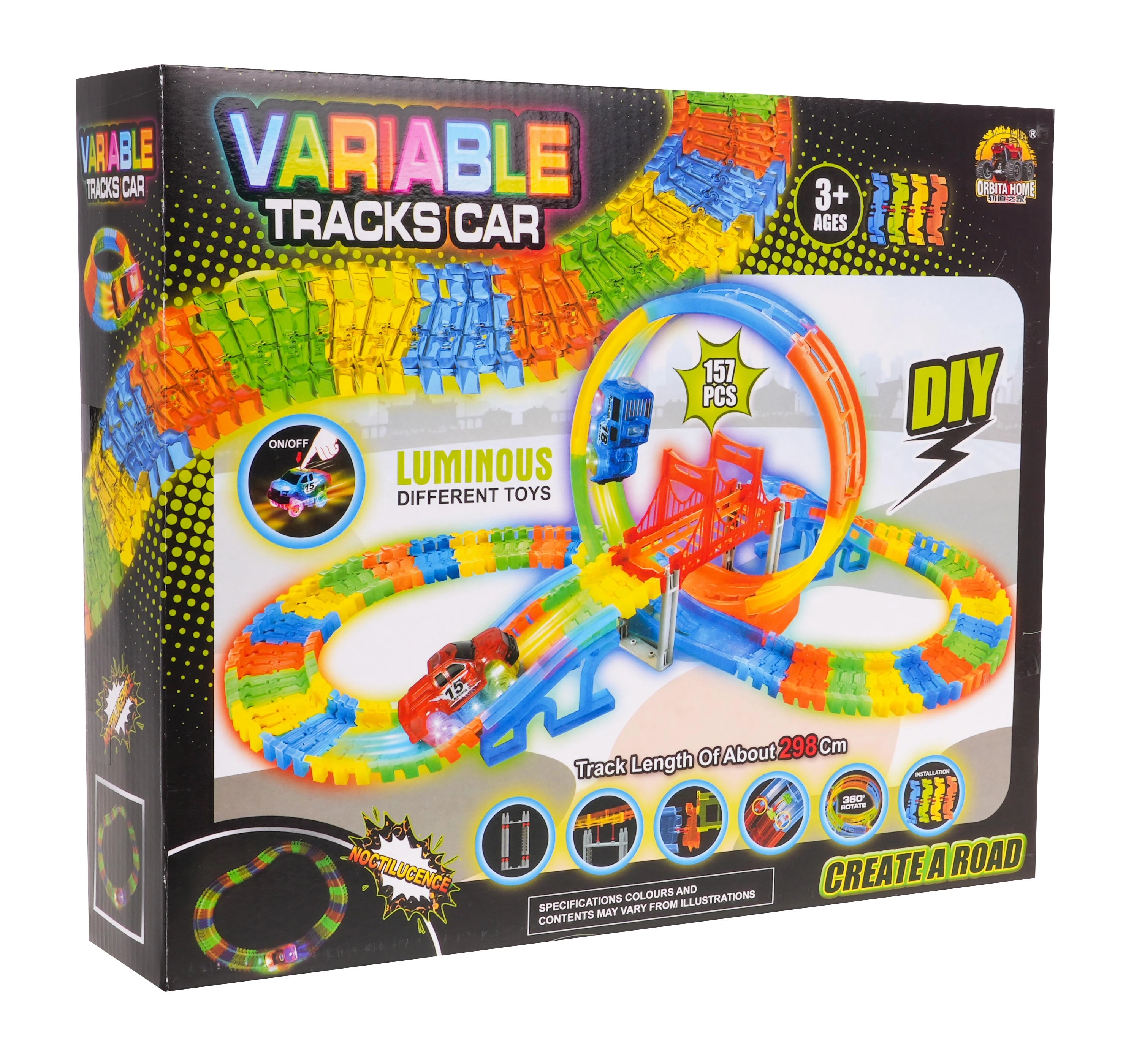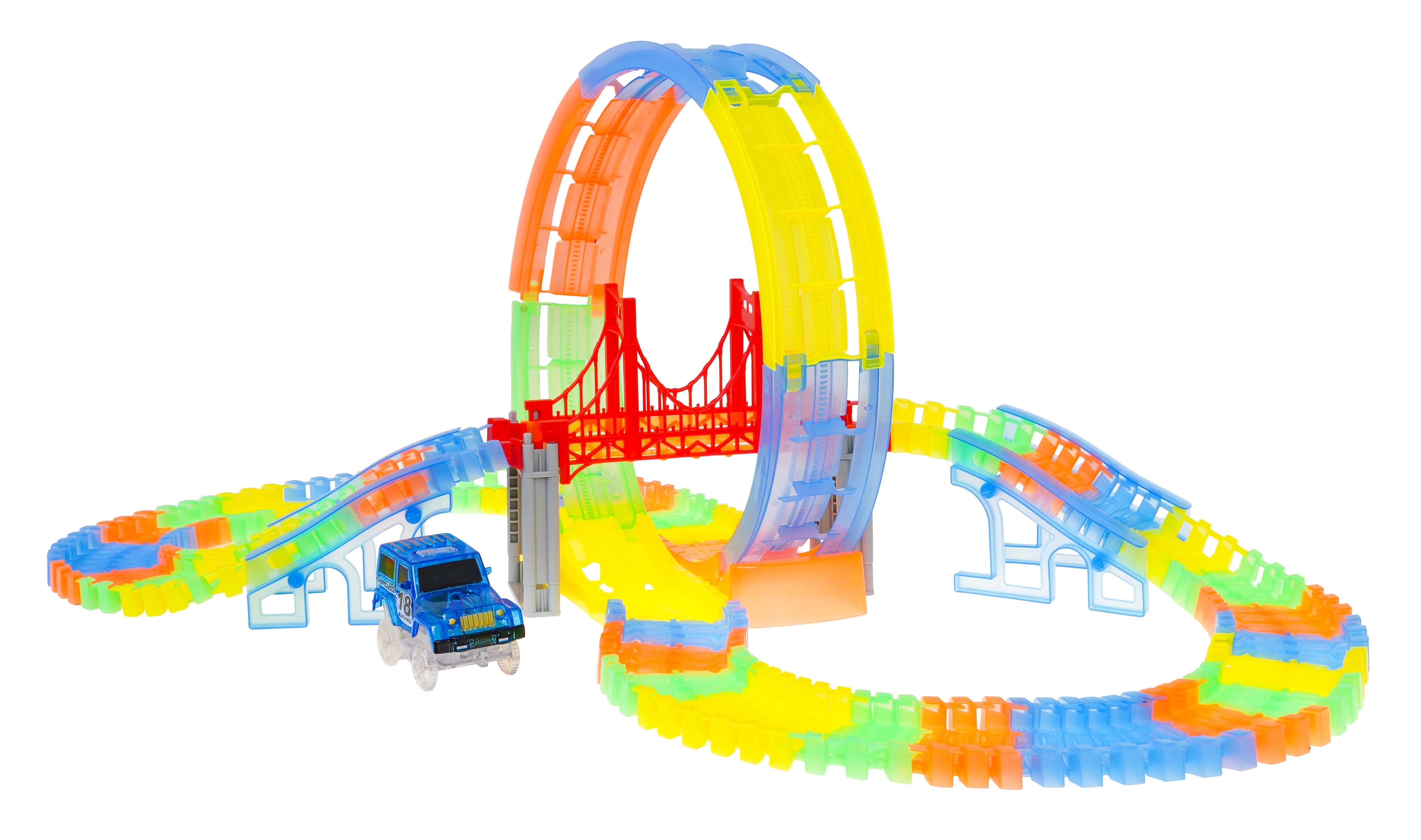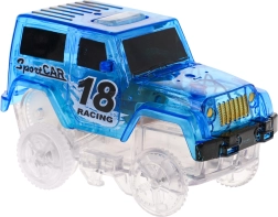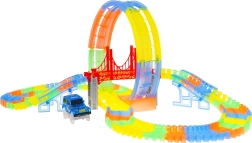 Ši spalvinga lenktynių trasa švyti tamsoje dėl fluorescencinių dalių ir komplekte esančio LED automobilio. Dalys paprastai susijungia, jas galima sukti, kelti ir pergrupuoti net važiavimo metu, kuriant naujas trasas su 360° kilpa, tiltais ir rampomis. Tereikia paspausti mygtuką ant automobilio stogo ir lenktynės gali prasidėti!