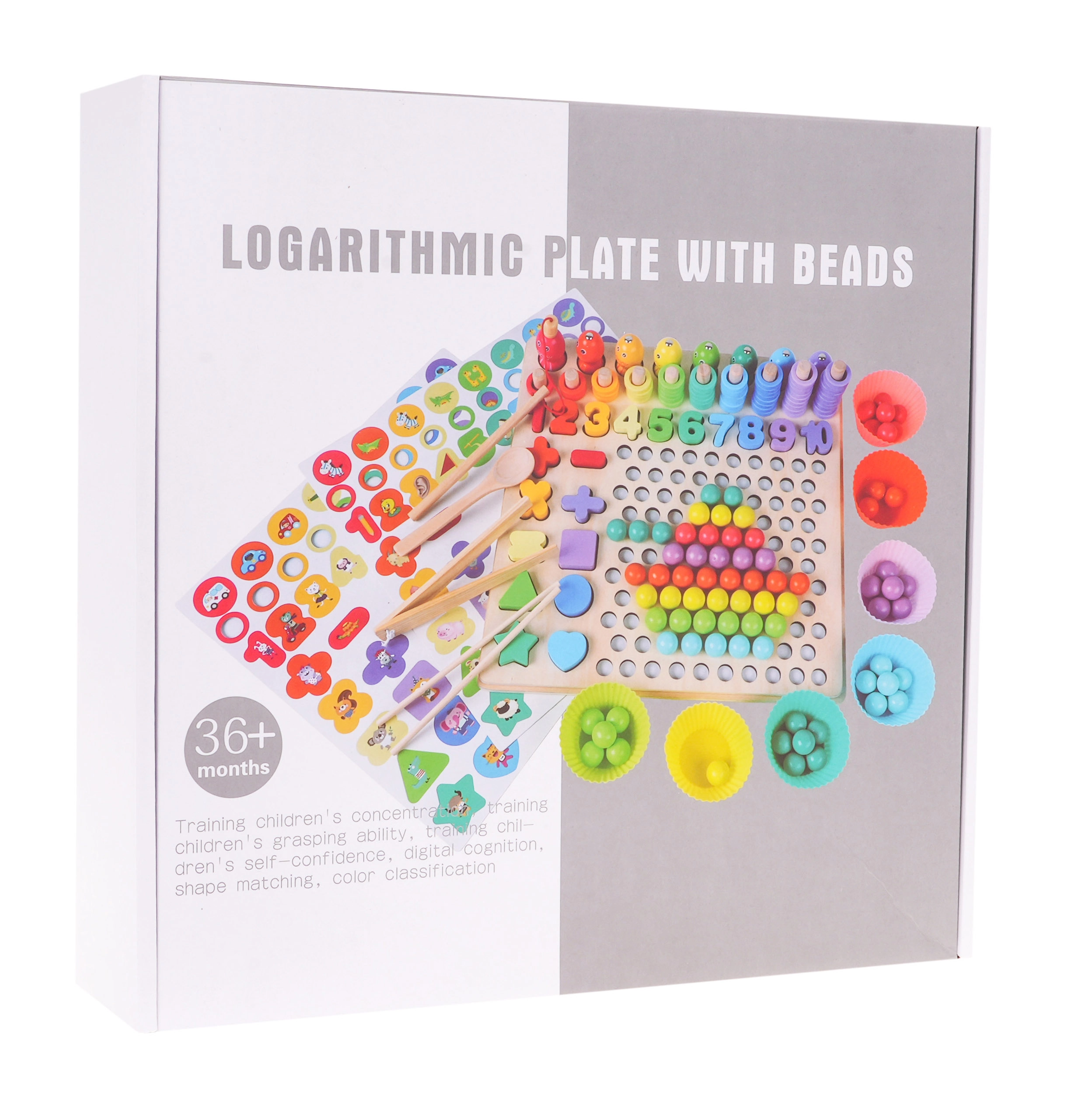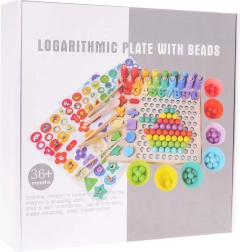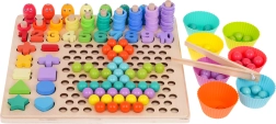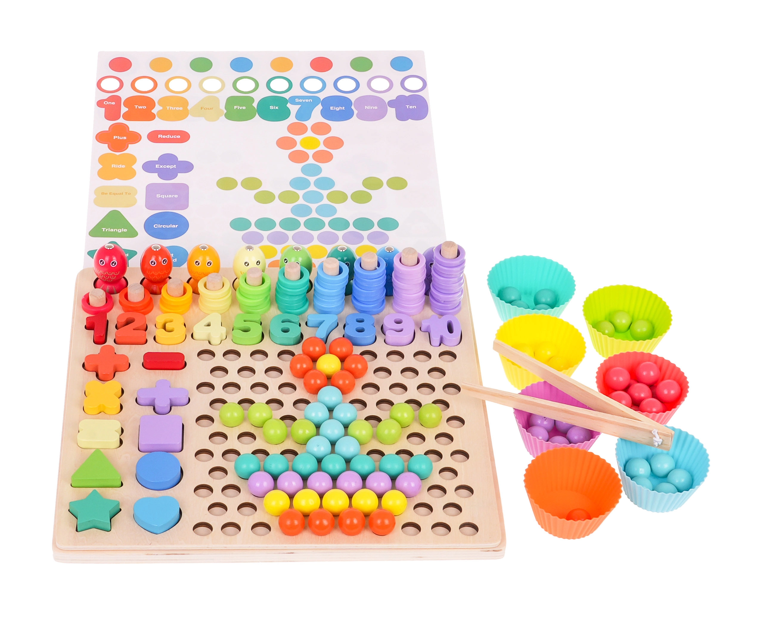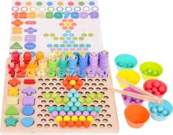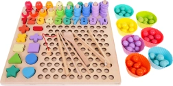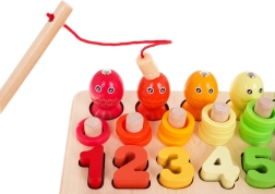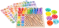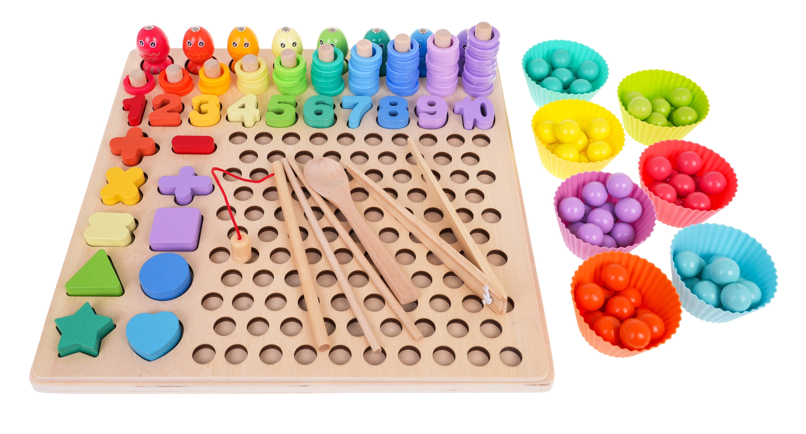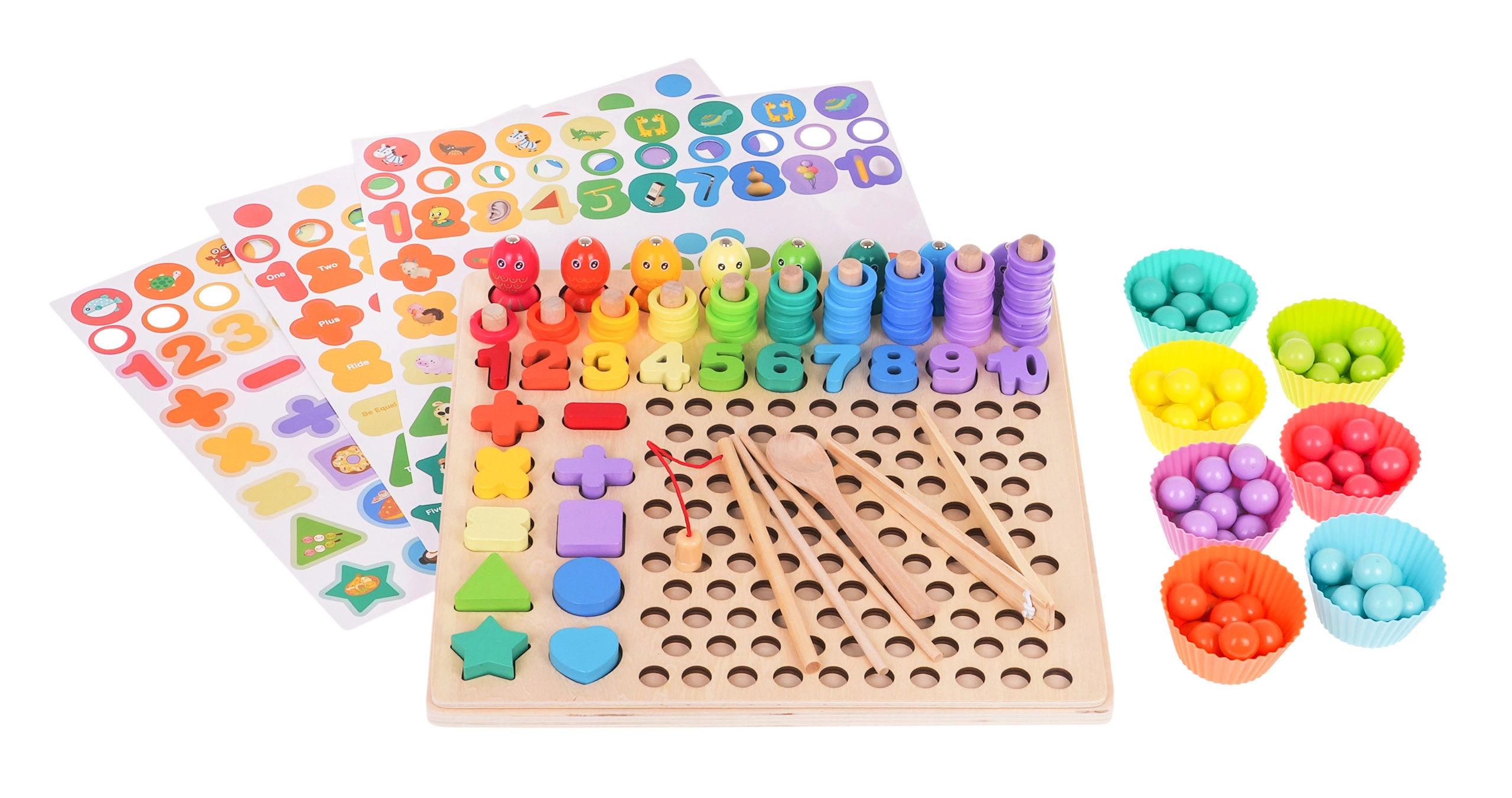 Ši spalvinga medinė edukacinė rinktinė siūlo vaikams dešimtis žaidimų galimybių: žvejybą su magnetine meškere, žiedų vėrimą ir skaičiavimą ant stulpelių, skaitmenų 1–10 dėliojimą, paprastų lygtelių sudarymą bei formų ir spalvų atpažinimą. Silikoniniai puodeliai ir mediniai karoliukai su pincetu, šaukšteliu ir pagaliukais puikiai lavina suėmimą ir tikslumą.