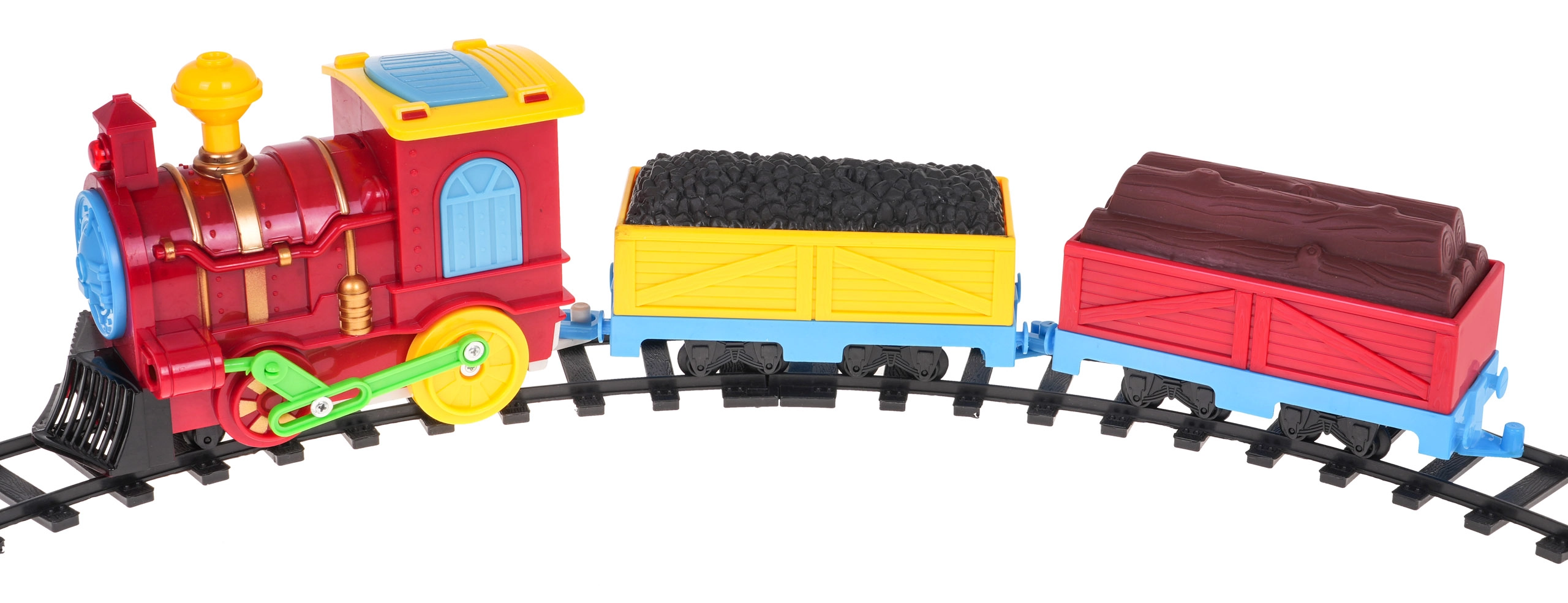 Rinkinyje yra 2 vagonai (su anglimi ir su medžiu), žiediniai bėgiai, kurių skersmuo apie 72,5 cm, ir priedai: kelio ženklai, kūgiai ir medeliai. Lengvas surinkimas ir tvirtas atlikimas užtikrina ilgas valandas pramogų ir vaizduotės lavinimą.