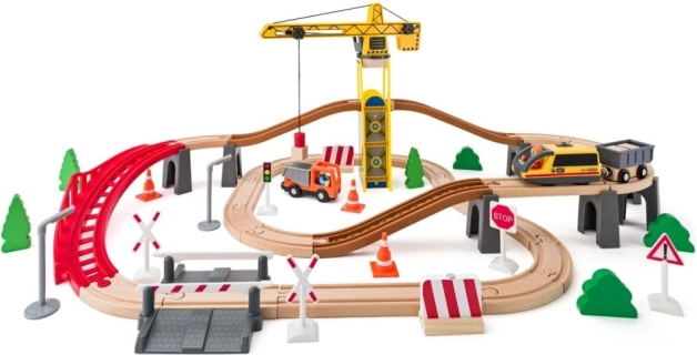 Medinė traukinių trasa su statybos tematika yra puikus pasirinkimas mažiesiems statytojams. Rinkinyje yra kranas krovimui, bėgiai ir priedai, kurie įtraukia vaikus į fantazijos pasaulį. Dėl tvirto medžio ir kruopštaus atlikimo žaislas yra patvarus ir saugus, todėl atlaikys kasdienius nuotykius.