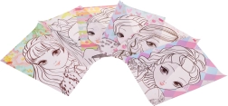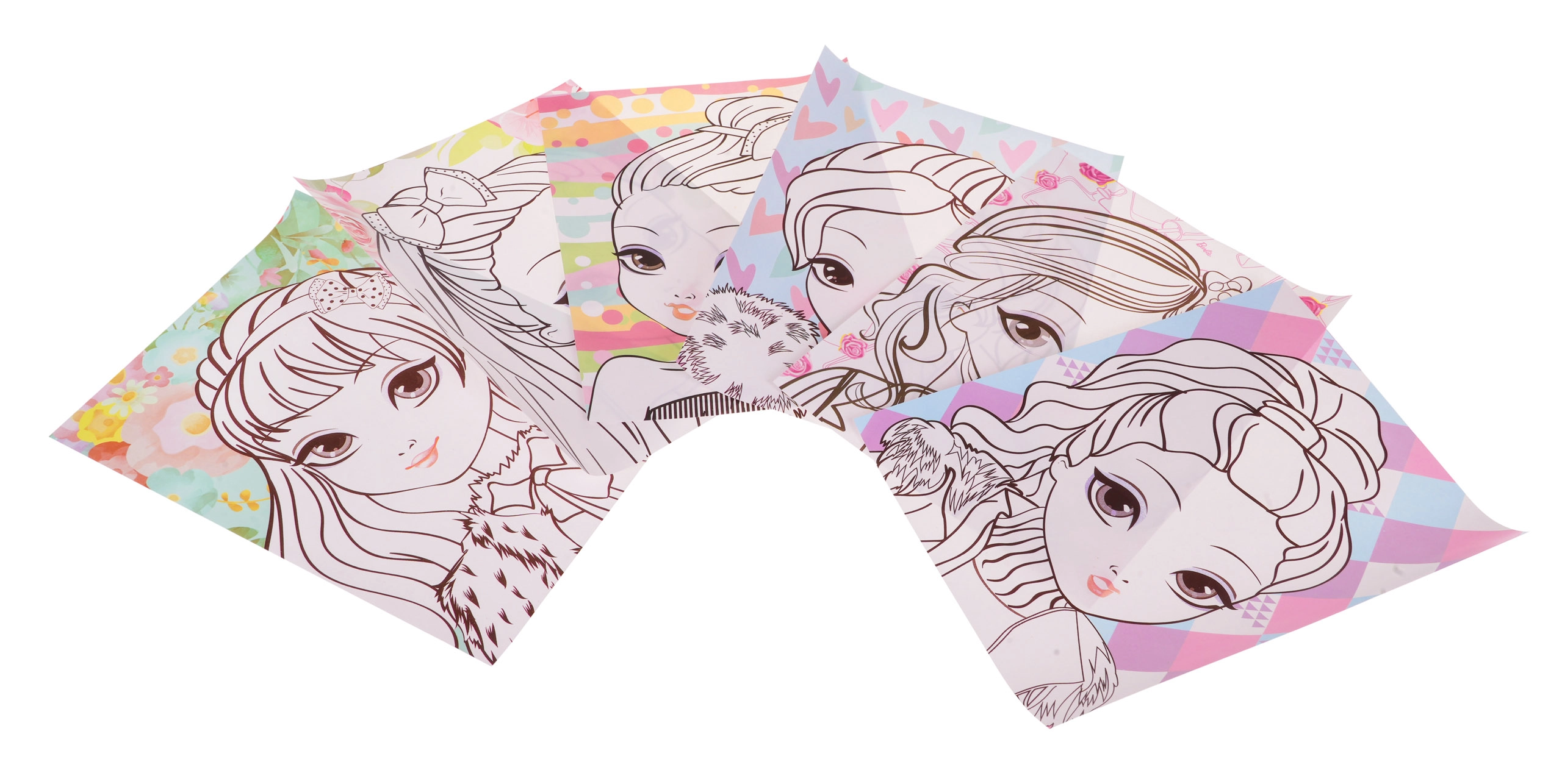 Rinkinyje yra šablonai ir paveikslėliai su princesėmis, leidžiantys vaikams kurti savo piešinius ir spalvinimus.