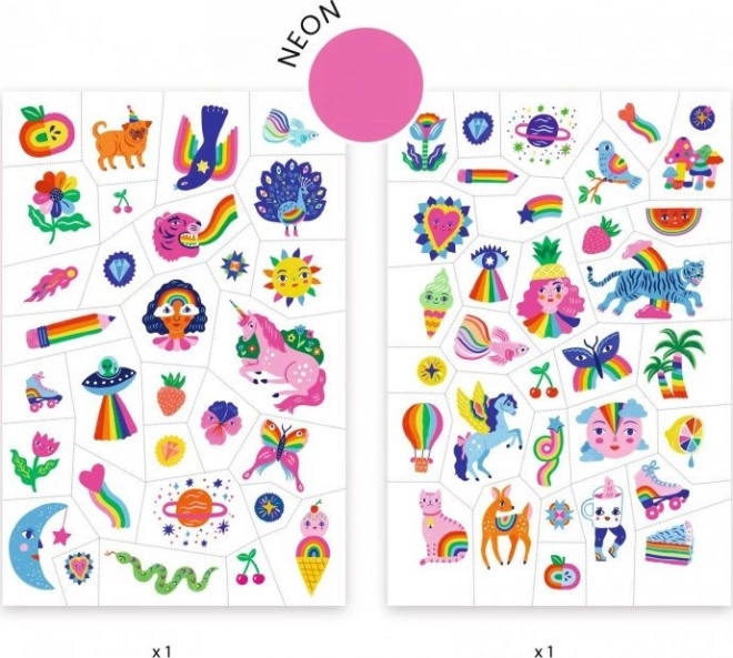 DJECO Rainbow tatuiruočių rinkinys atneša ryškias spalvas ir subtilias, stilingas iliustracijas, kurias pamėgs vaikai. Uždėjimas ypač greitas – tereikia iškirpti, nuplėšti plėvelę ir prispausti; tatuiruotė akimirksniu persikelia ant odos be vandens.