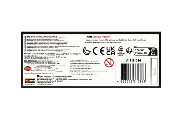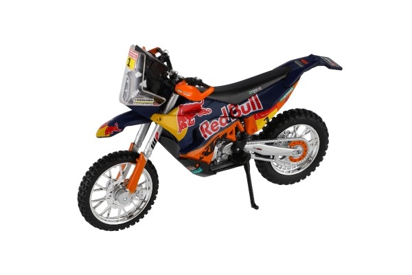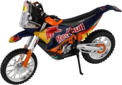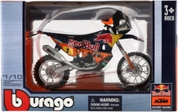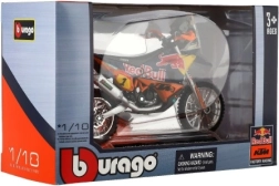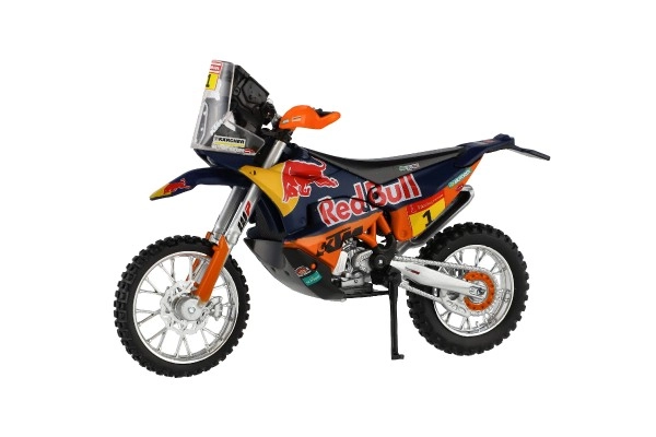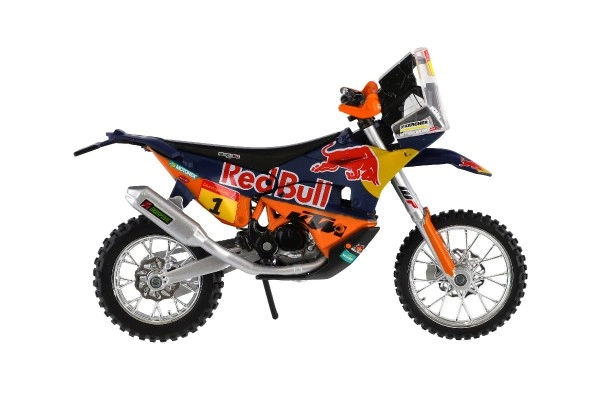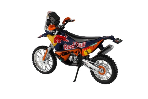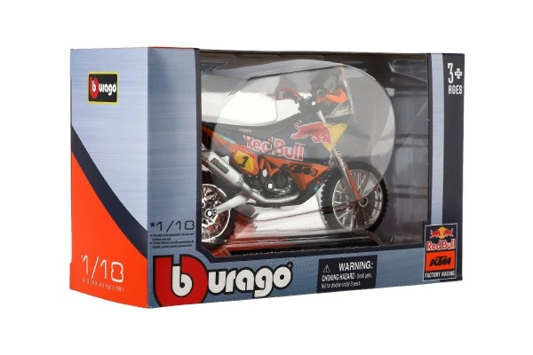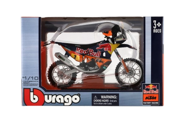 BBURAGO lenktyninio motociklo modelis masteliu 1:18 tiksliai atkuria RED BULL KTM dizainą iš 2019 m. Rally Dakar – įskaitant ryškų oranžinai mėlyną dažymą, logotipus ir lenktyninius elementus. Dėl metalinių ir plastikinių dalių derinio modelis atrodo tvirtas ir kartu išlaiko precizišką atlikimą.