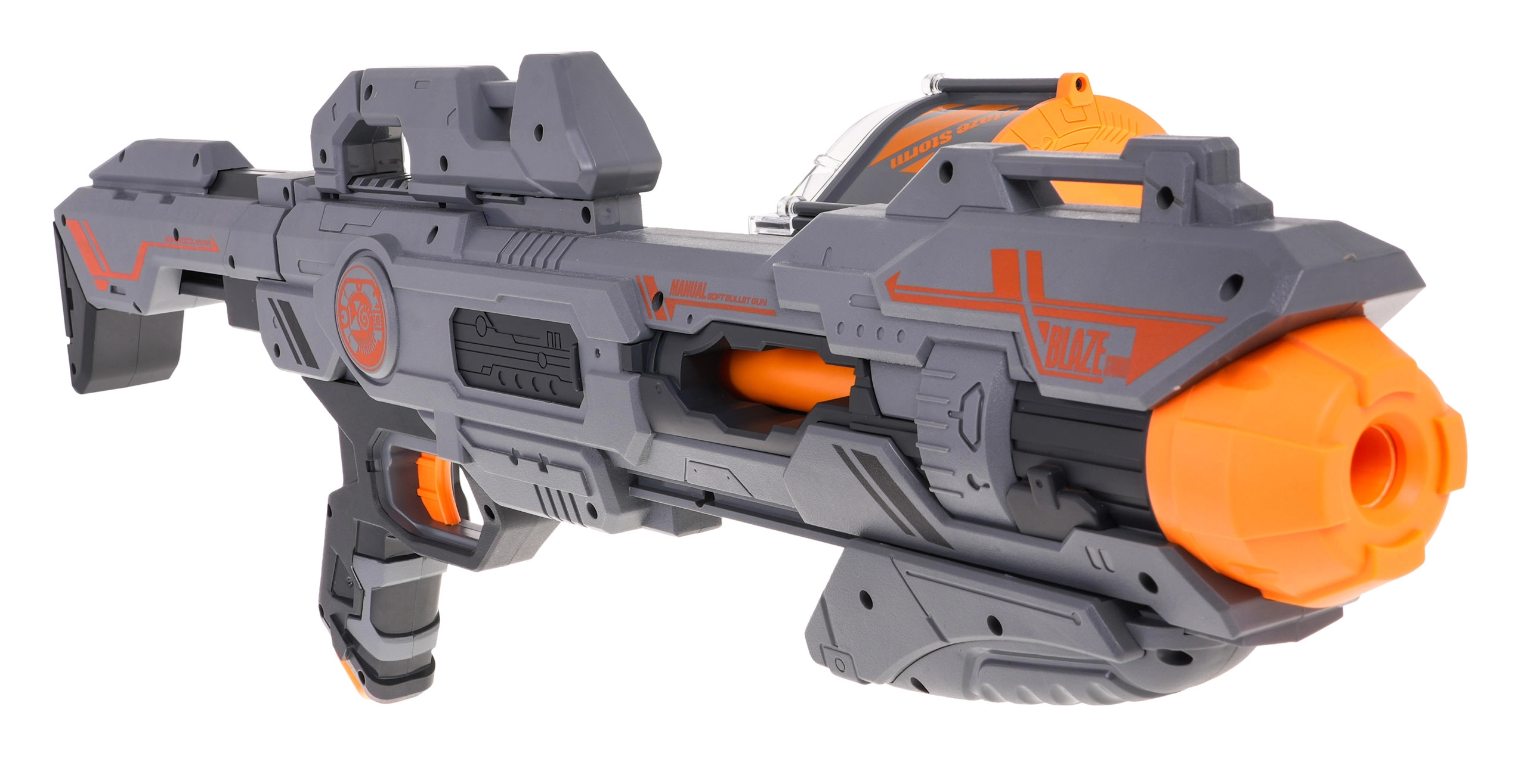 Mega Blaze Storm pilka šautuvas – puikus žaislas vaikams nuo 8 metų, siūlantis pramogą su 40 minkštų šovinių, kurie užtikrina saugų žaidimą. Šautuvui nereikia baterijų, o dėl rankinio užtempimo mechanizmo jį lengva naudoti.