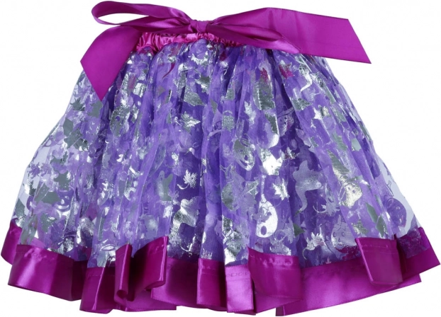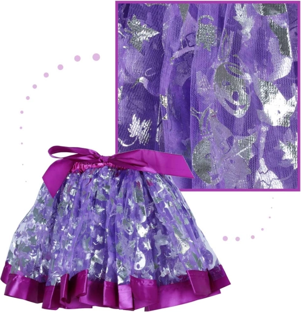 Purpurinis sijonėlis su blizgiais sidabriniais raštais ir tampriu juosmeniu lengvai prisitaiko prie įvairių figūrų.