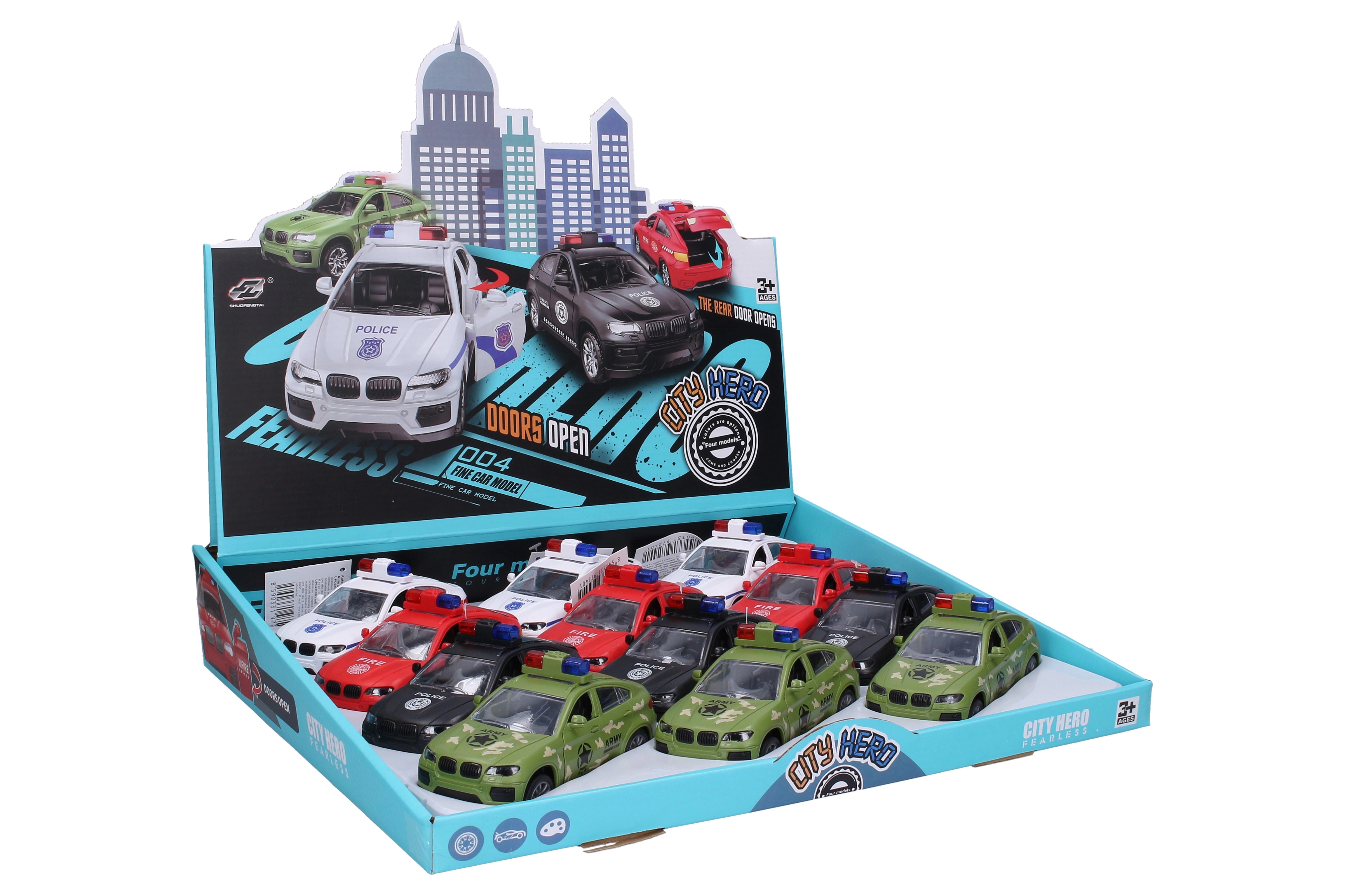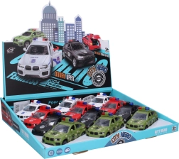 Galimos 4 dizaino versijos – gaisrinė, karinė, SWAT policija ir balta policijos mašina – idealiai tinka kolekcijai ar kaip dovana. Modelis yra kompaktiško dydžio 13 × 6 × 6 cm, o inercinė pavara leidžia lengvai pajudėti į priekį po pastūmimo.