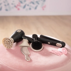 Keičiami džiovintuvo antgaliai, plaukų tiesintuvas, šepetys, šukos, segtukai ir gumytės – viskas fantazijos kupinoms šukuosenoms kurti.