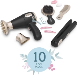 - Visa komplektacija: džiovintuvas su šviesos ir garso efektais, keičiami antgaliai, plaukų tiesintuvas, šepetys, šukos, segtukai ir gumytės.