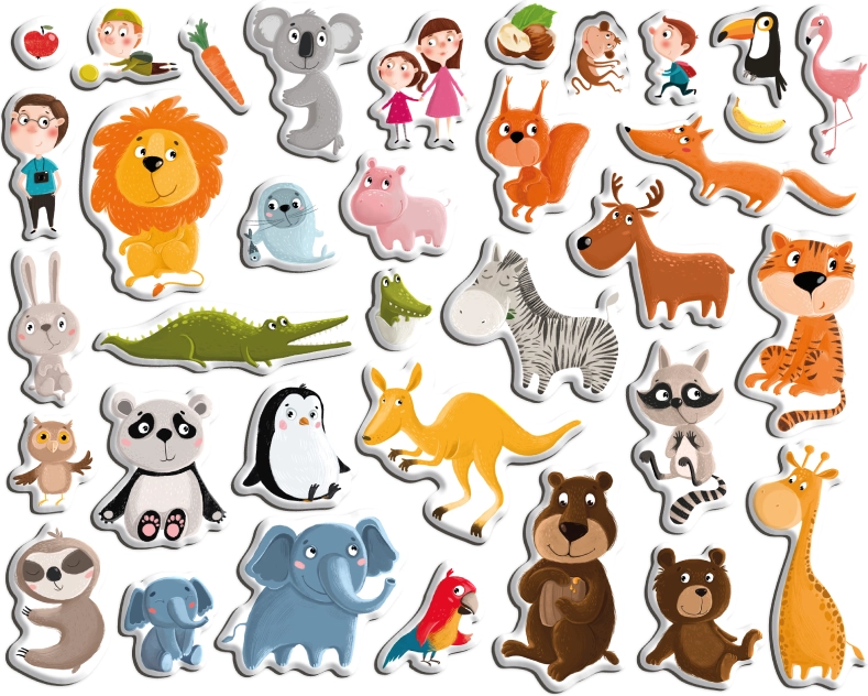 - 35 magnetiniai elementai su zoologijos sodo gyvūnais neribotoms žaidimo scenų kombinacijoms.