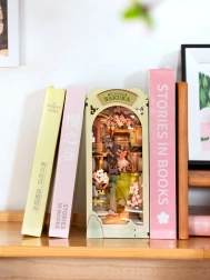 Vidinis apšvietimas švelniai paryškina scenos detales ir kuria jaukią nuotaiką tarp knygų. Tinka ir kaip dekoracija, ir kaip praktiškas skirtukas lentynoje.