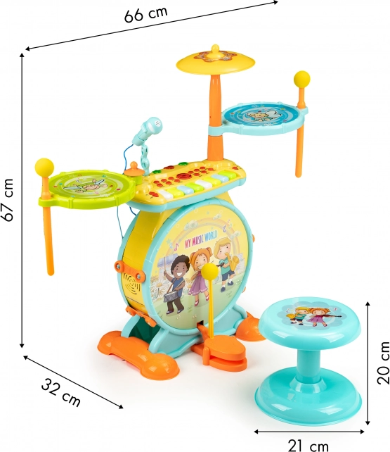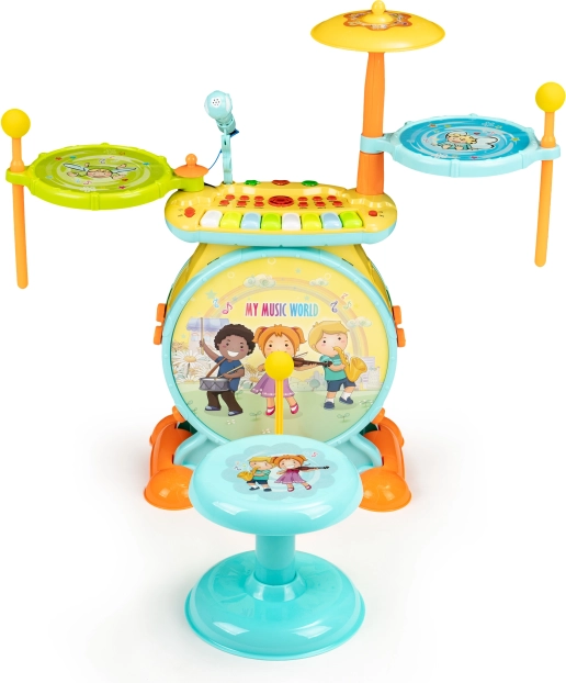 Leiskite savo vaikams pasinerti į melodijų pasaulį ir kurti savo dainas su šiuo įspūdingu muzikiniu rinkiniu. Vaikiška būgnų seto išvaizda primena tikrą muzikinį instrumentą ir yra komplektuojama su kėdute patogiam grojimui. Vaikai bus sužavėti galimybėmis, kurias suteikia šis rinkinys, įskaitant karaokę ir prijungimą prie telefono ar mp3 grotuvo.