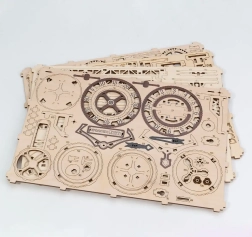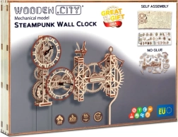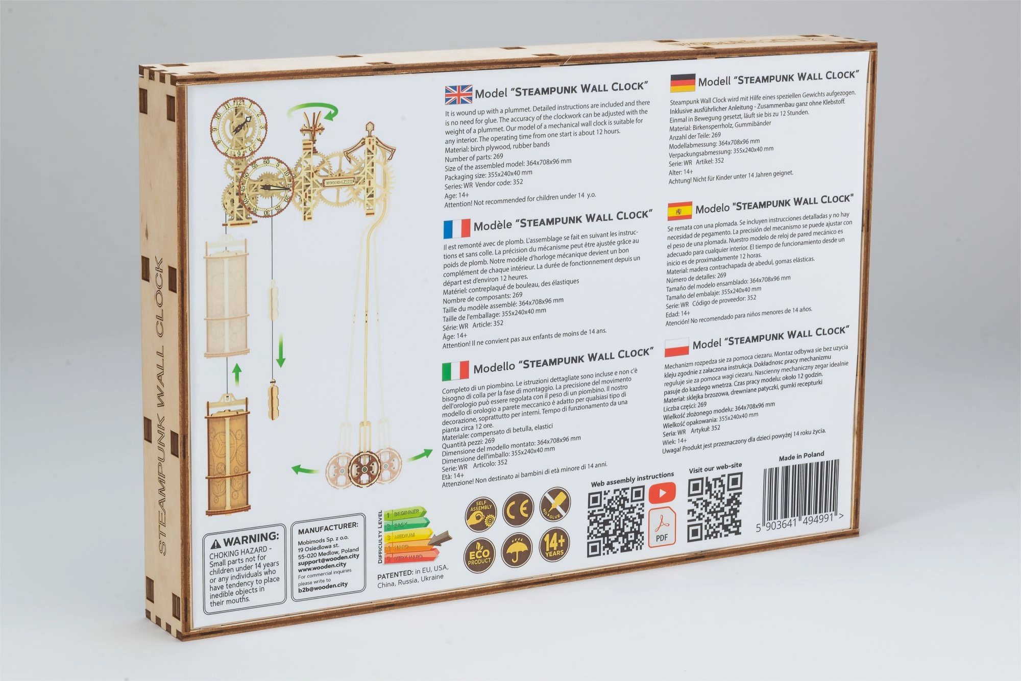 Atraskite mokslo ir meno sintezę mediniame 3D sieninio laikrodžio modelyje STEAMPUNK WOODEN CITY. Iš 269 preciziškai išpjautų beržo faneros dalių surinksite pilnai veikiantį mechaninį įrenginį su švytuokle ir eigos reguliavimu. Užvedus laikrodis patikimai veikia iki 12 valandų ir sužavi tiek dizaino, tiek technikos mėgėjus.