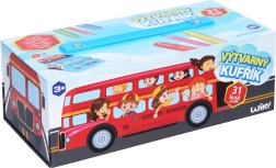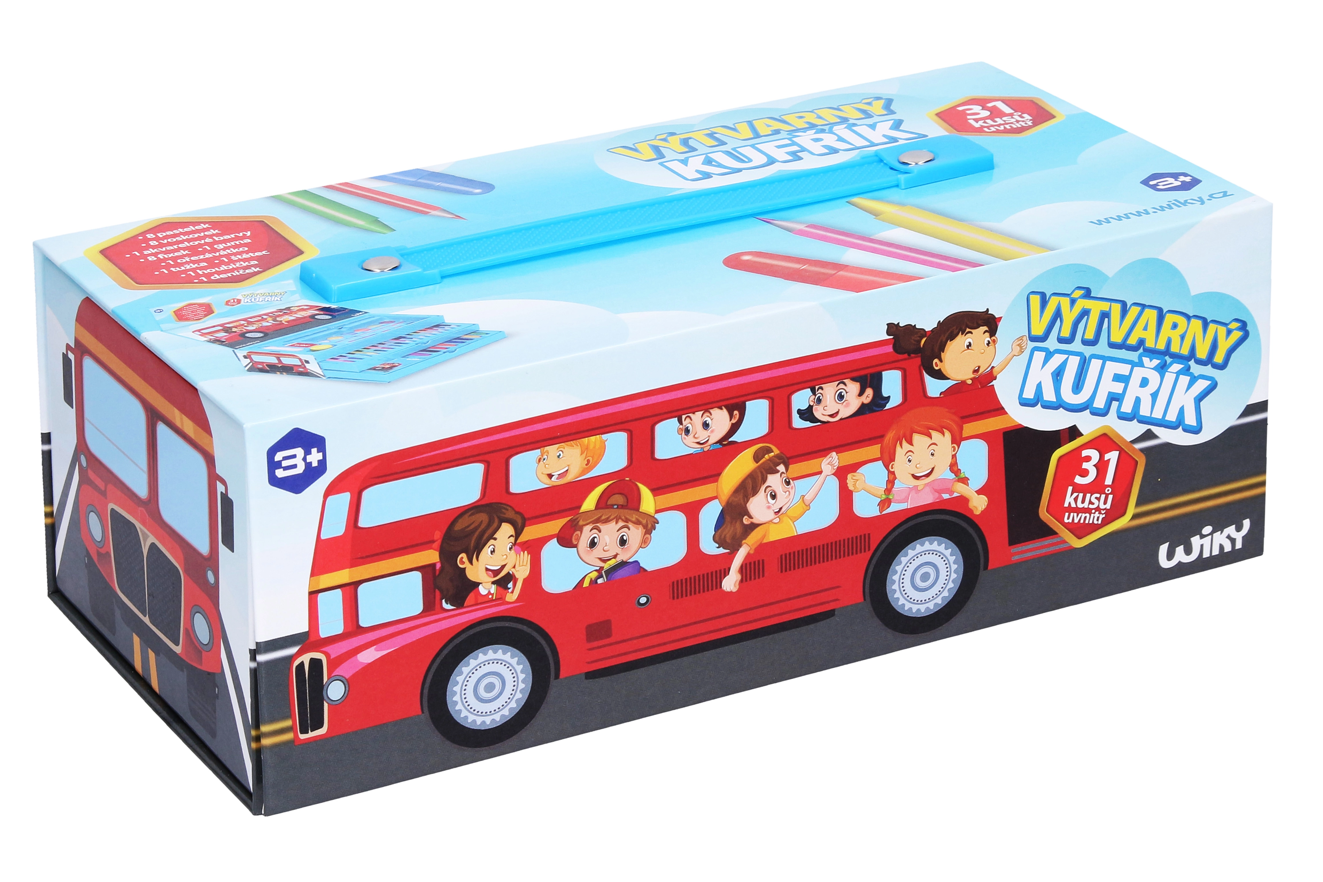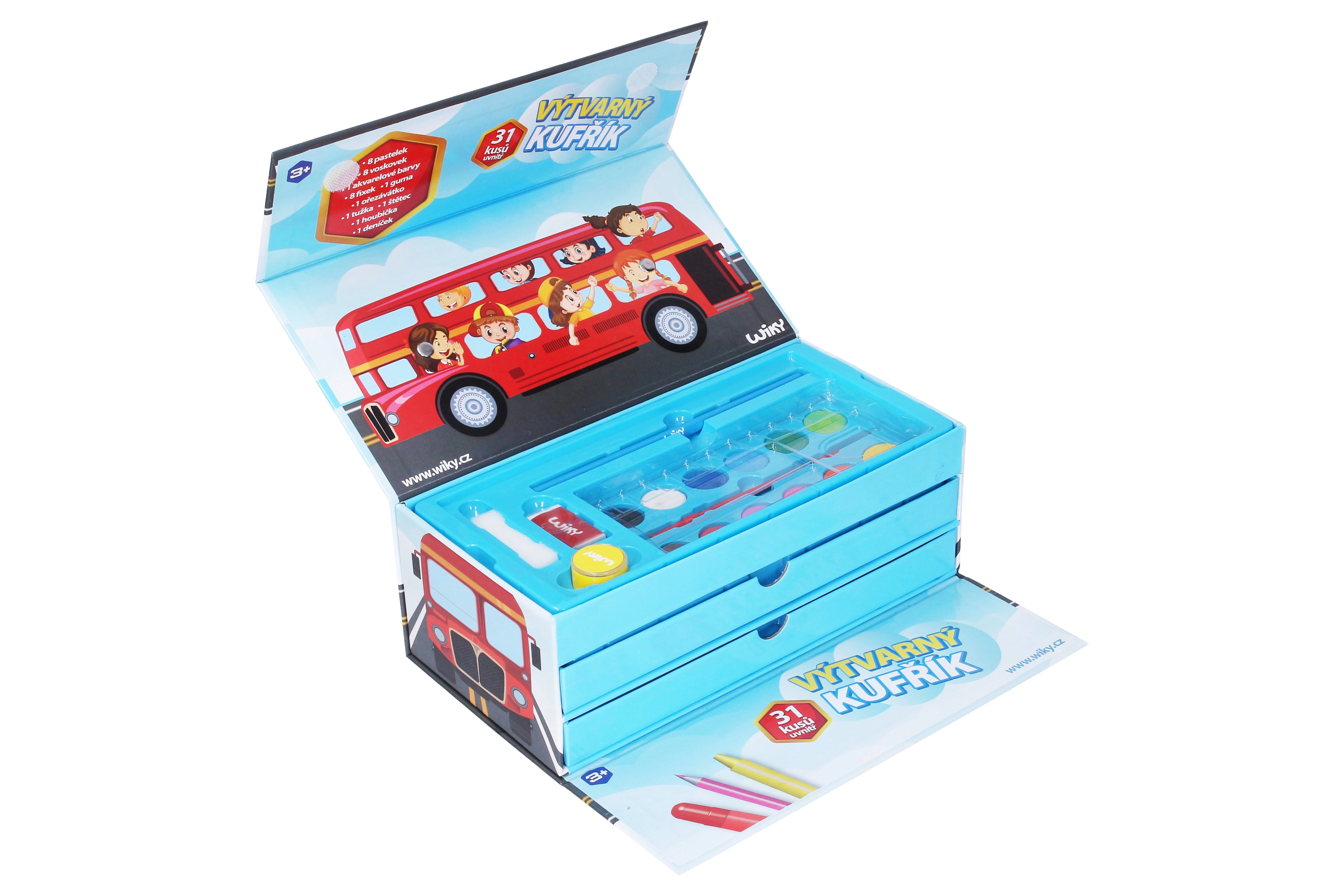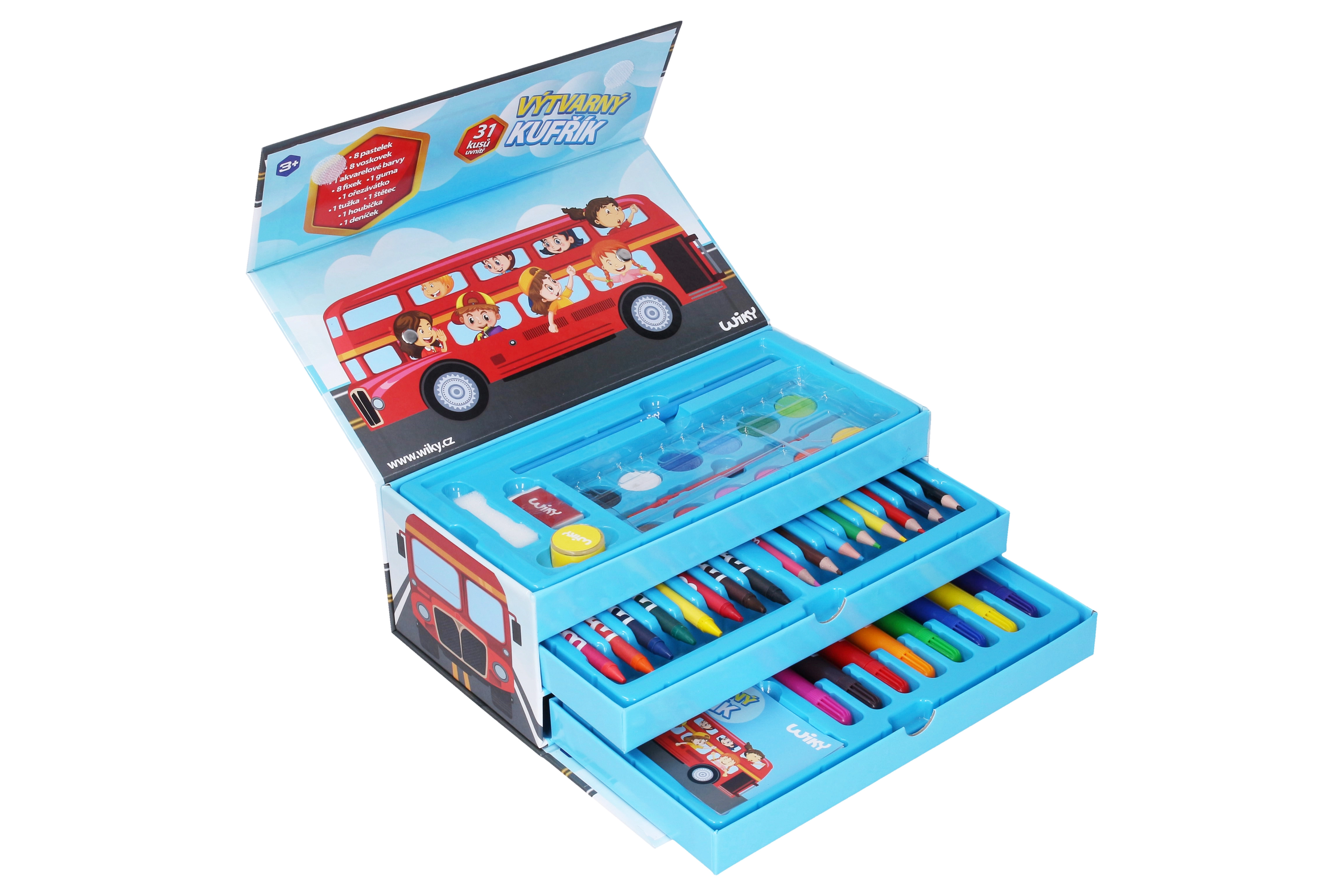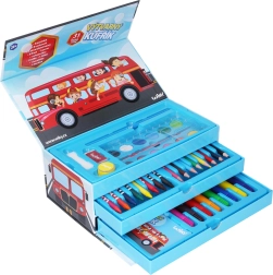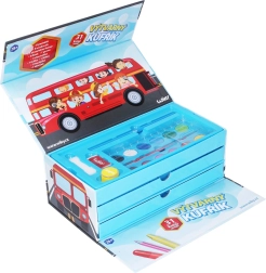 Viskas, ko reikia jauniems menininkams, viename patogiame lagaminėlyje su autobuso motyvu: 31 vnt. dailės priemonių – pieštukai, vaškai, flomasteriai, akvareliniai dažai, trintukas, drožtukas, pieštukas, teptukas, kempinėlė ir užrašų knygelė. Idealu kelionėms ir namuose bei kaip puiki dovana kūrybingiems vaikams.