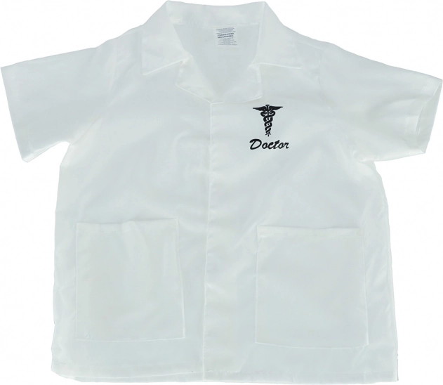 Balta gydytojo chalatėlis su trumpomis rankovėmis, dviem kišenėmis ir kaducejaus simboliu su užrašu „Doctor“.