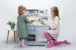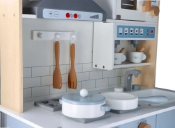 Viryklė, orkaitė, mikrobangų krosnelė ir kriauklė sukuria autentišką aplinką. Sukami ratukai ir mygtukai skatina vaikus tyrinėti ir užsiimti sensoriniu žaidimu.