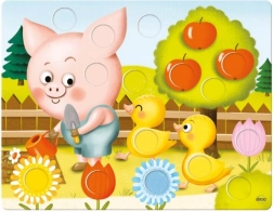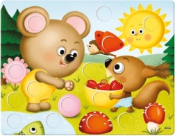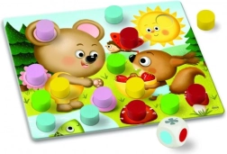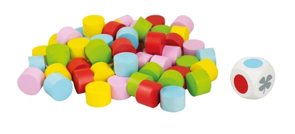 - Rinkinyje yra kartoninis žaidimo planas, spalvotos medinės cilindro formos kaladėlės ir kauliukas.