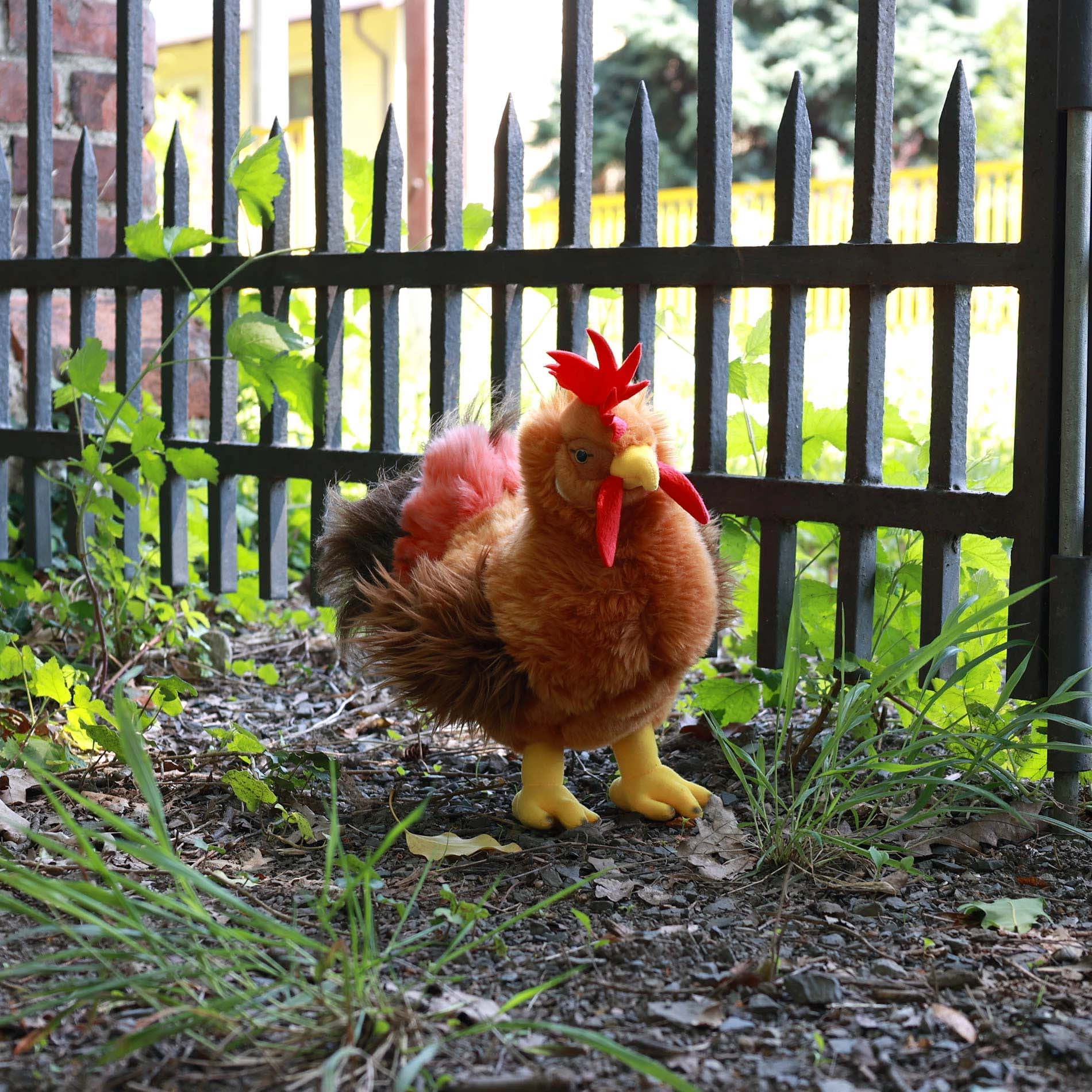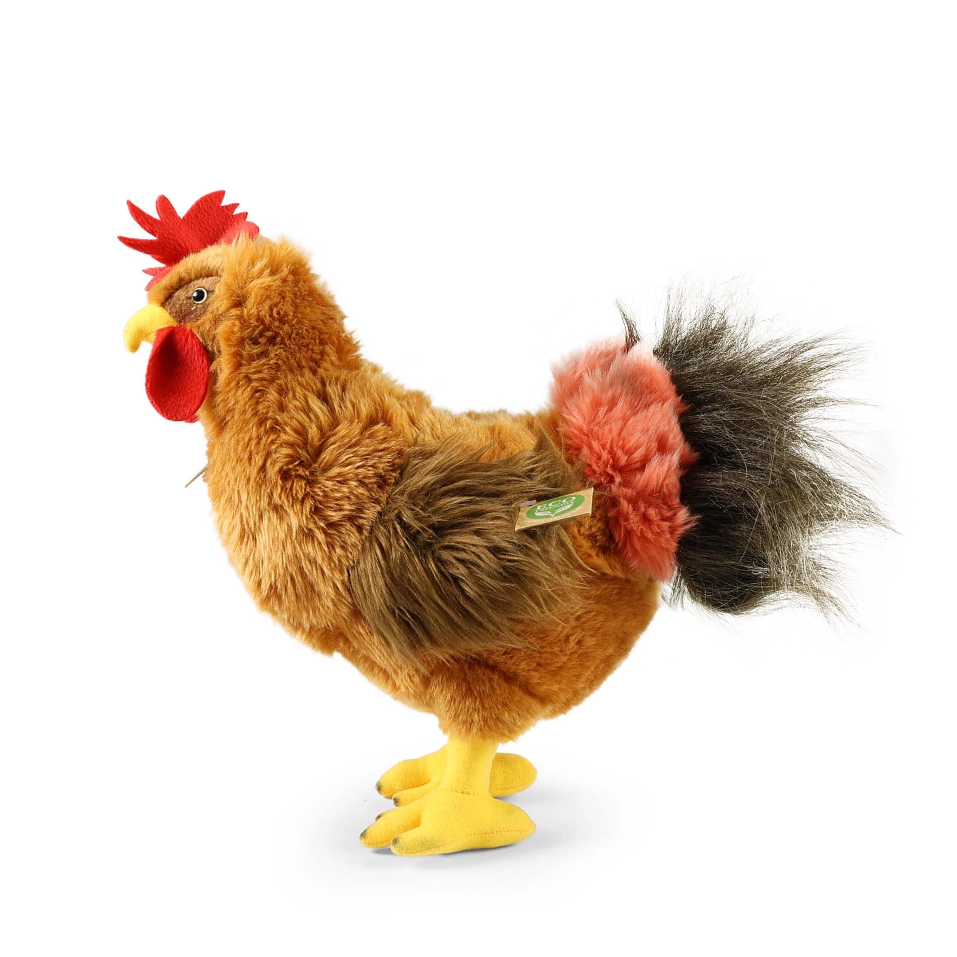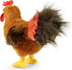 Smulkūs siuviniai, ryškus skiauterėlis, spalvinga uodega ir tikroviškos proporcijos daro šį gaidį puikiu pliušiniu žaislu ir dekoracija.
