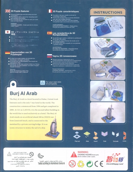 Dėlionė 3D dėlionė Burj Al Arab tikrai pradžiugins kiekvieną architektūros mylėtoją. Šis detaliai ištobulintas 3D modelis, dar vadinamas „buriniu laivu“, atneša dalelę Dubajaus tiesiai į jūsų namus.