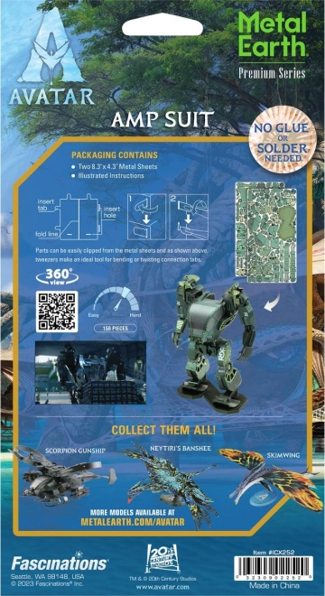 Prabangi Metal Earth serija pristato realistišką AMP Suit modelį iš Avatar visatos, išpjautą iš plieninių lakštų naudojant lazerinį graviravimą. Kiekviena dalis tiksliai įsistato į kitą, tad be klijų ir litavimo sukursite įspūdingą kolekcinį kūrinį su autentiškomis detalėmis ir būdingu kariniu įvaizdžiu.
