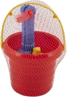 Ši smėlio žaislų rinkinio sudėtis: spalvotas kibirėlis, semtuvėlis, grėbliukai ir dvi formelės, puikiai pritaikytos mažoms vaikiškoms rankutėms. Pagaminta iš kokybiško ir patvaraus plastiko, kuris užtikrina ilgą tarnavimo laiką net intensyviai žaidžiant smėlyje.