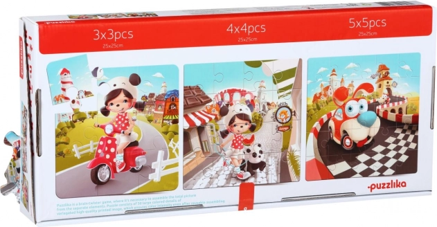 Puzzlika Laimingi pasakojimai 3 viename – puiki linksma dėlionė, specialiai sukurta mažiems vaikams. Kiekviename rinkinyje yra 50 tvirtų ir patvarių detalių, iš kurių galima sudėti tris atskirus 25 x 25 cm paveikslėlius. Kiekvienas paveikslėlis turi skirtingą detalių skaičių: 3x3, 4x4 ir 5x5. Gamyboje naudojamas kokybiškas daugiasluoksnis kartonas su blizgiu paviršiumi, iš ekologiškai užaugintos medienos. Dėlionę galima lengvai valyti drėgna šluoste.