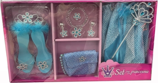 Išpildykite kiekvienos mažos princesės svajonę su šiuo princesės rinkiniu mėlynos spalvos. Rinkinyje yra sijonėlis, šlepetėlės, karūna, rankinė, lazdelė ir papuošalai – viskas, ko reikia magiškam princesės vaidmenų žaidimui.