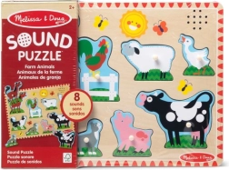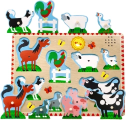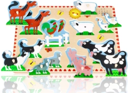 Smagi ir edukacinė medinė dėlionė vaikams su ūkio gyvūnų motyvais. Dėl spalvingų detalių ir lengvo paėmimo vaikai mokosi atpažinti gyvūnus ir lavina smulkiąją motoriką.