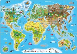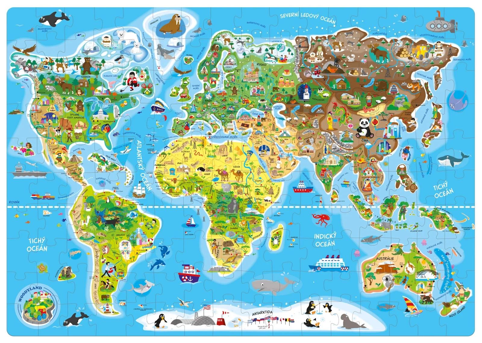 Atraskite pasaulį neišeidami iš namų su linksmomis dėlionėmis vaikams ir suaugusiesiems. Geografinė dėlionė su pasaulio žemėlapiu pateikia žemynų apžvalgą, pasaulio įžymybes ir gyvūnus pagal regionus. Puikiai tinka pramogai ir mokymuisi, su iliustracijomis, sukurtomis čekų dailininko.
