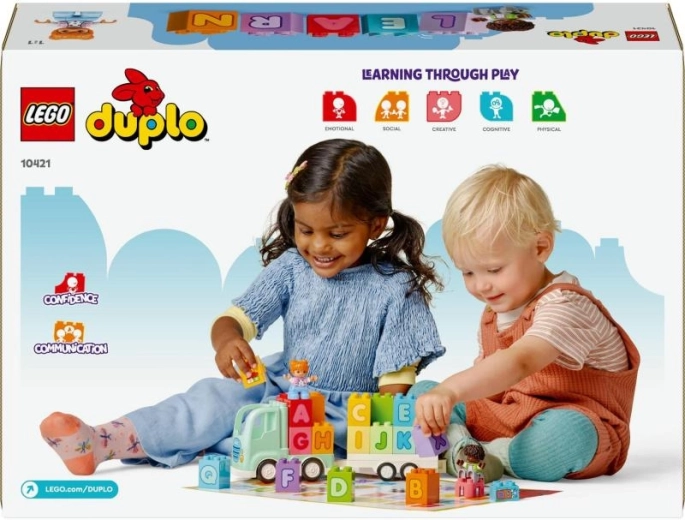 LEGO DUPLO Sunkvežimis su abėcėle suteikia vaikams smagią pažintį su raidėmis. Dėl didelių ir lengvai sugriebių detalių mažyliai mokosi spalvų, raidžių ir paprasto žodžių dėliojimo, kartu lavindami akių–rankų koordinaciją. Riedantis sunkvežimis su atkabinama priekaba ir dviem figūrėlėmis kviečia į atvirą vaizduotės kupiną žaidimą.
