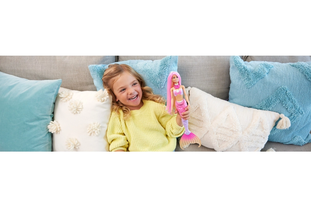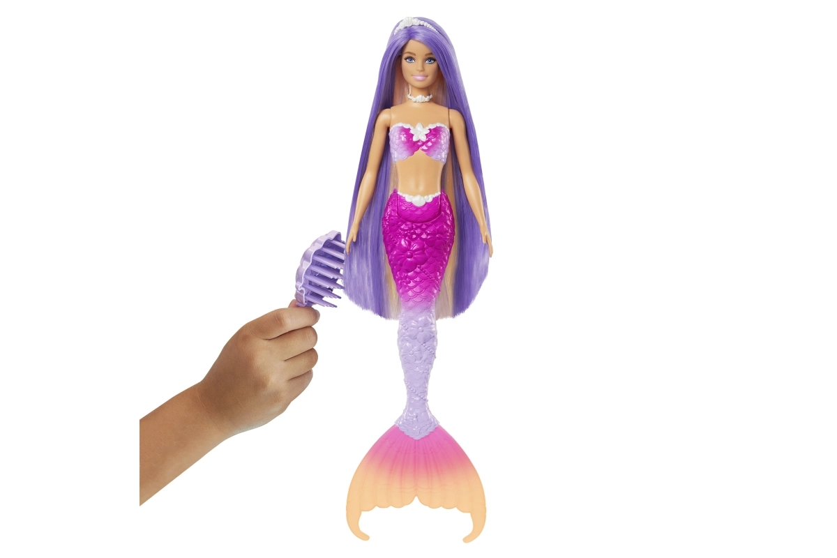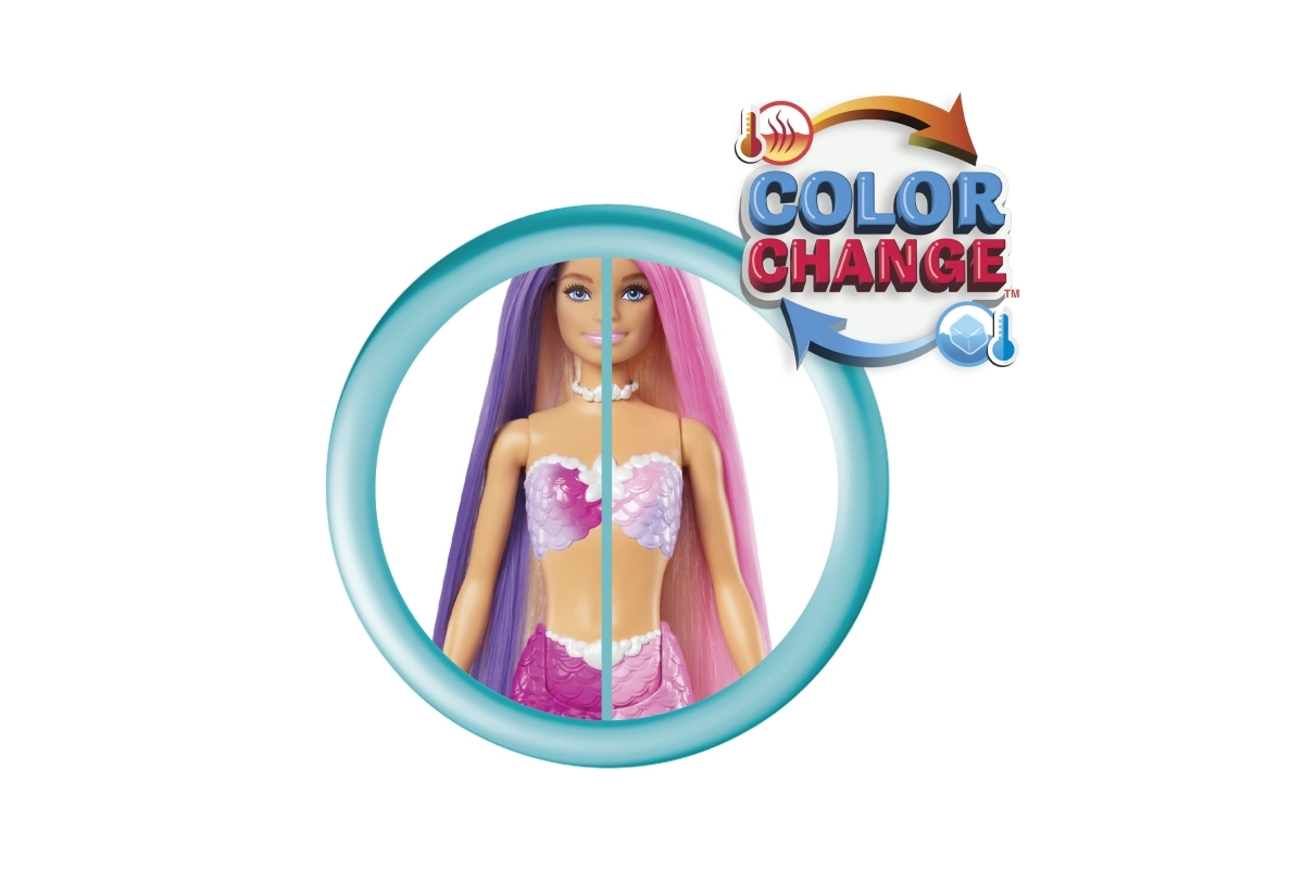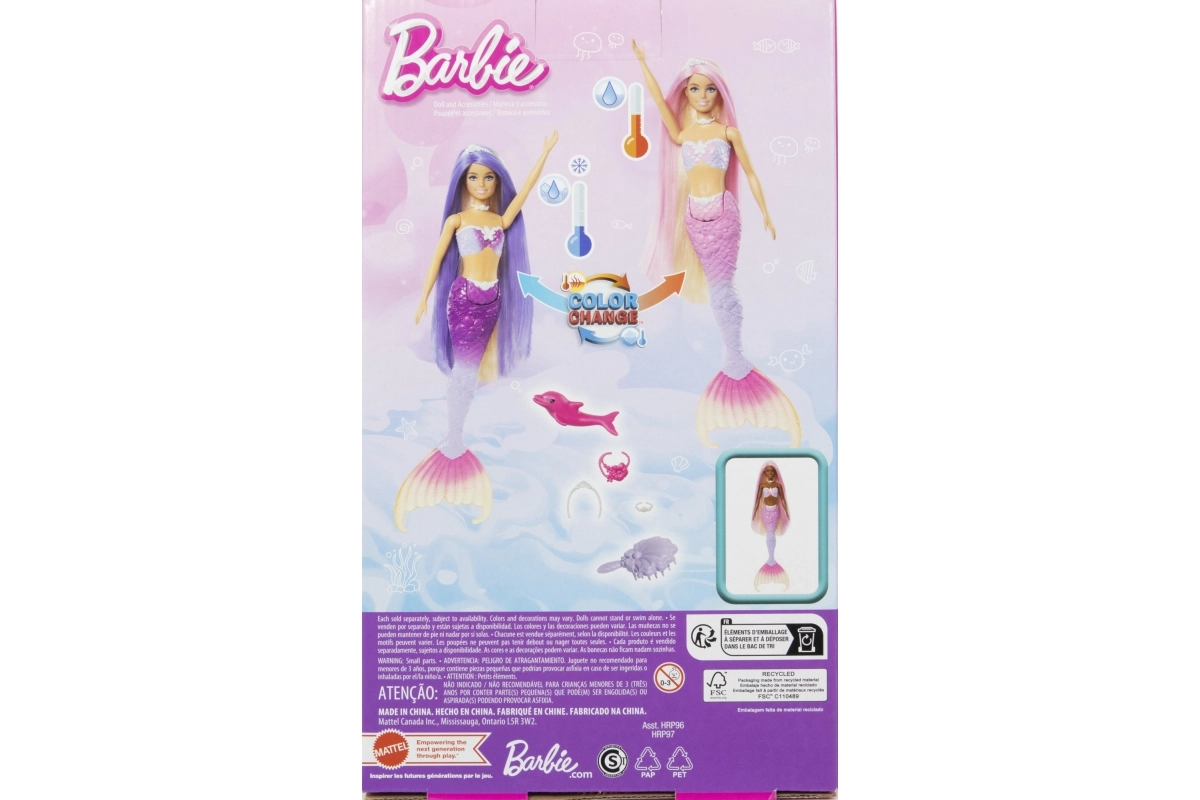 Leiskitės į povandeninį nuotykį su Barbie Malibu lėle, įkvėpta magiškų nuotykių. Lėlė žavi spalvų keitimo efektu – panardinkite ją į ledinį vandenį ir stebėkite, kaip plaukai, liemenėlis ir uodega iš rožinės tampa violetiniai, o šiltame vandenyje vėl grįžta į rožinę. Šį efektą galima kartoti be galo.