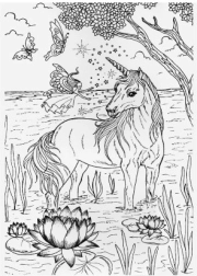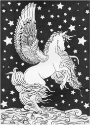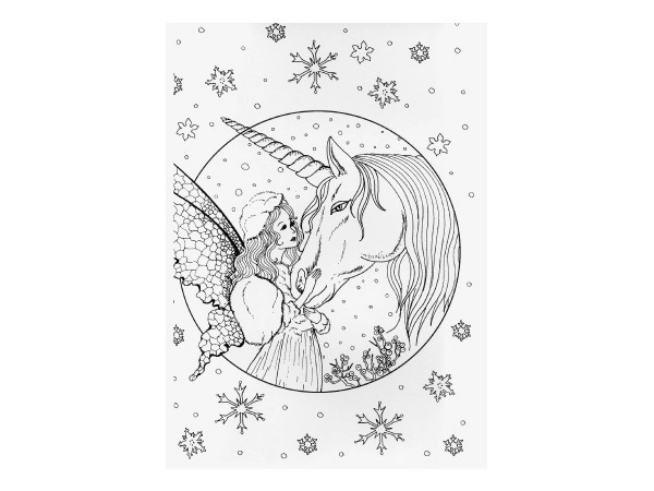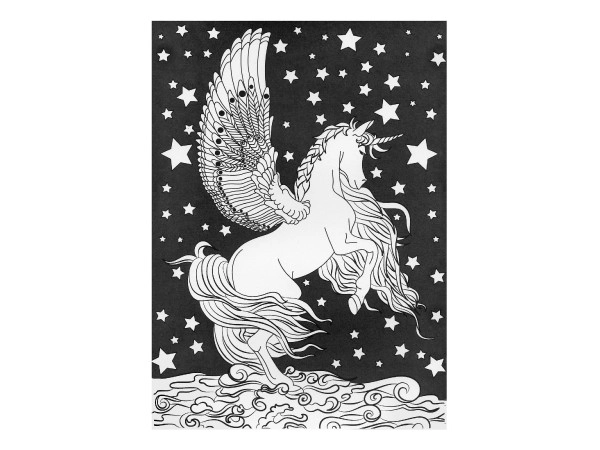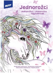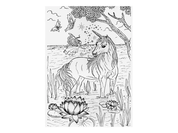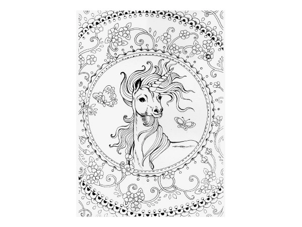 Spalvinimo paveikslai apima vienaragių motyvus magiškose aplinkose, papildytus detalėmis, tokiomis kaip gėlės ir drugeliai, kurie pažadina vaizduotę.