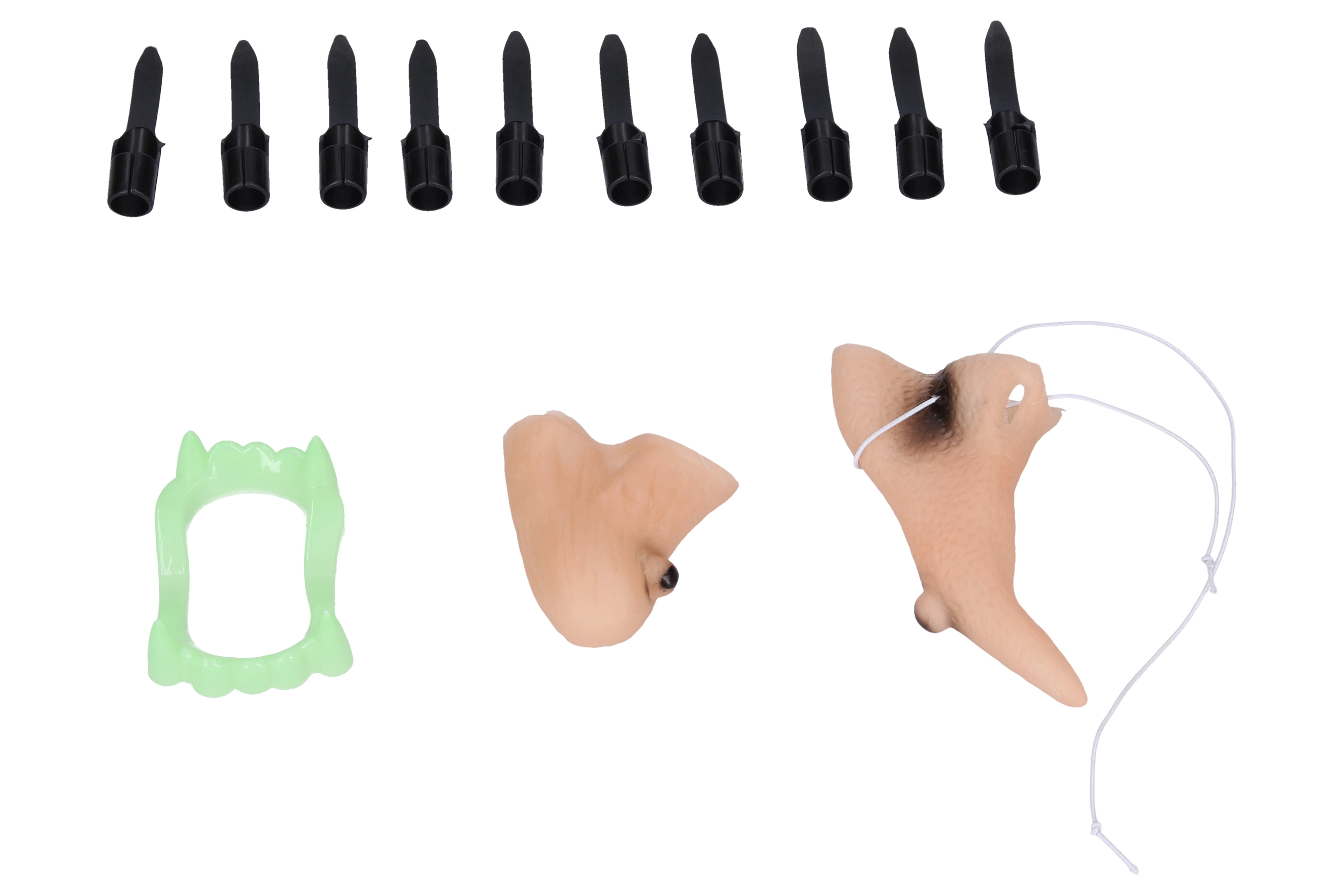 - Pilnas rinkinys – skrybėlė, barzda, nosis, 10 pirštų su nagais ir dantys