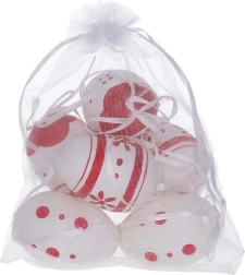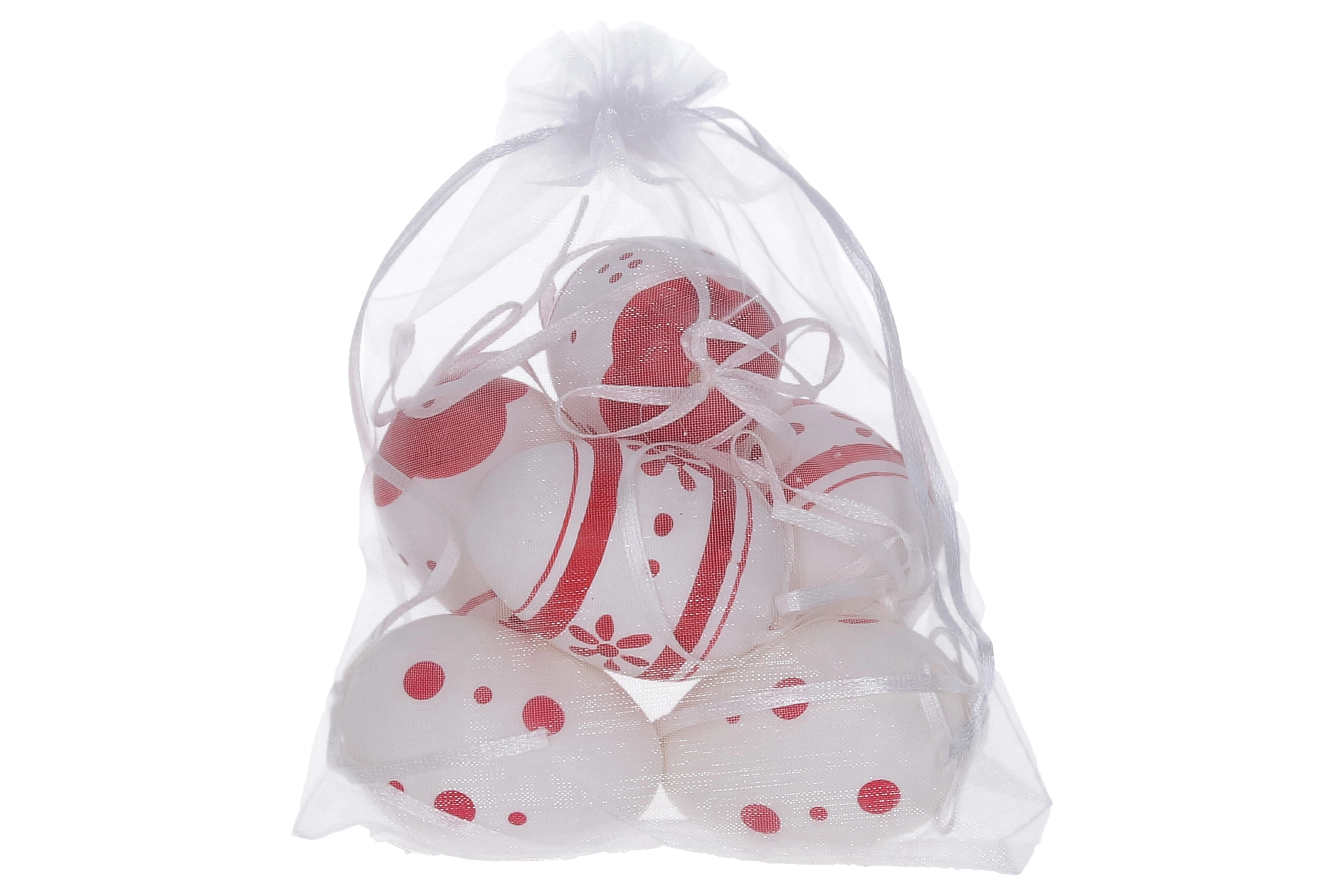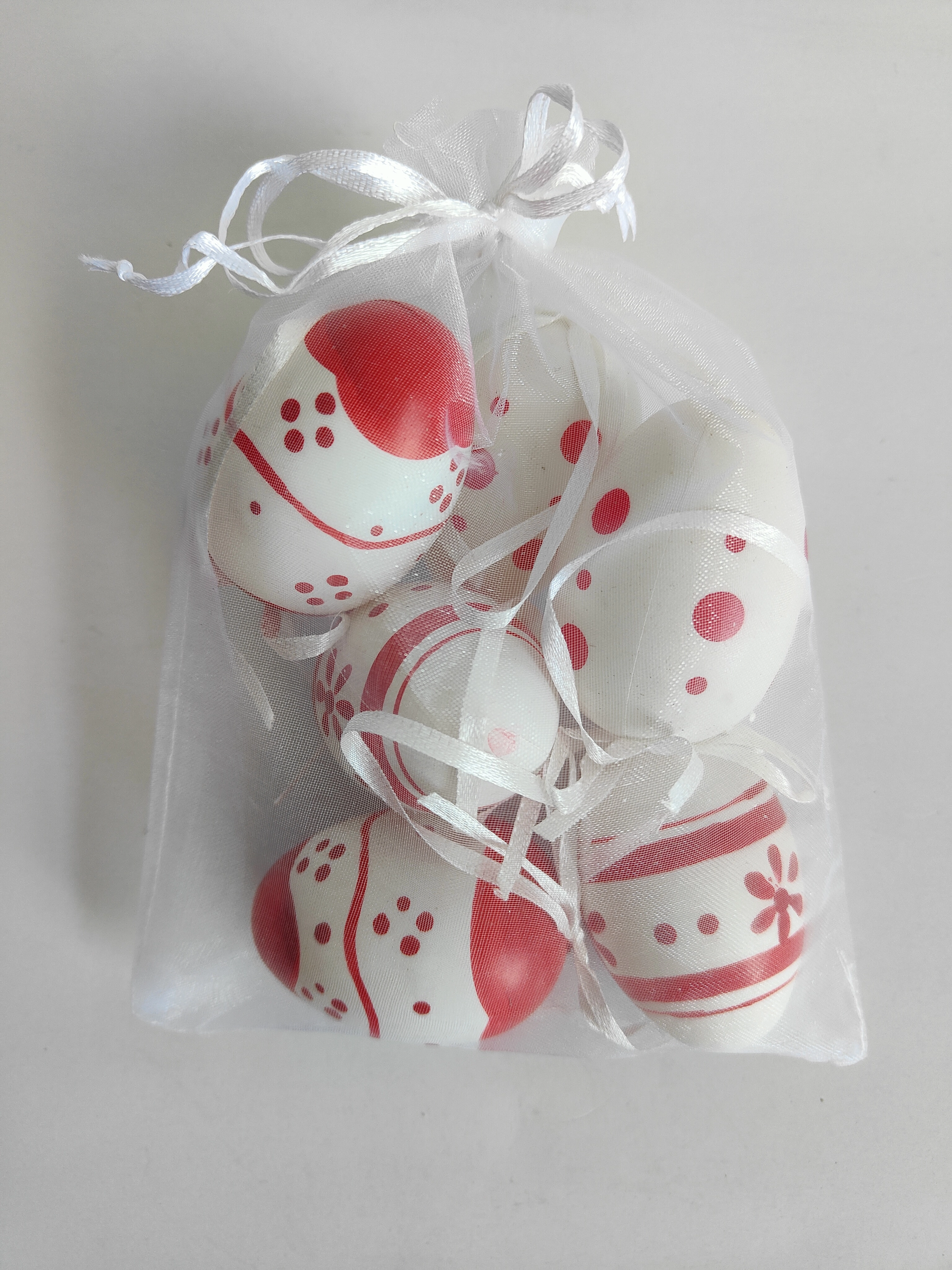 Dekoratyviniai dažyti plastikiniai kiaušiniai, kurių dydis 6 cm, idealiai tinka jūsų šventinėms dekoracijoms. Gaunate 6 vienetus elegantiškame organzos maišelyje.