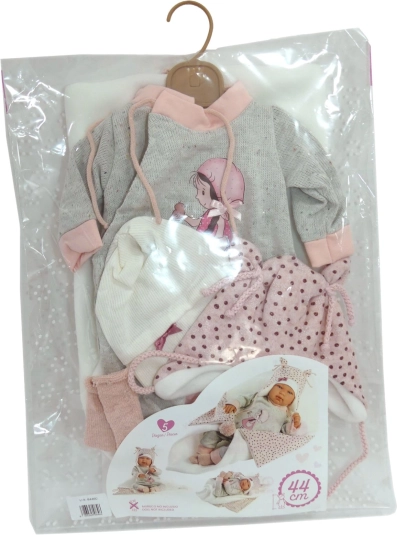 Stilingas 4 dalių rūbelių rinkinys NEW BORN lėlėms, dydis 43–44 cm, siūlo švelnų rožinės ir pilkos derinį, minkštą antklodėlę su kutu surišimui ir aukštos kokybės rankų darbo ispanišką gamybą. Praktiška pakuotė ant plastikinio pakabo skaidriame dėkle ir saugus atlikimas vaikams nuo 3 metų.