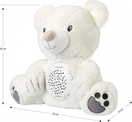 Pliušinis žaislas su projektoriumi Milly – puikus pagalbininkas tėvams ramindami ir migdydami kūdikius. Įjungus projektorių, atsitiktinai parenkama viena iš 10 lopšinių melodijų, o tuo pačiu metu rodomas naktinis dangus.