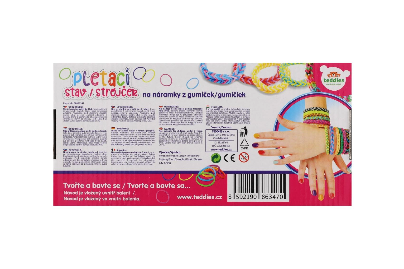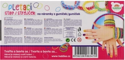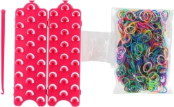 - 600 vnt. silikoninių gumyčių (spalvų miksas), trijų eilių staklės, vąšelis, užsegimai, instrukcija