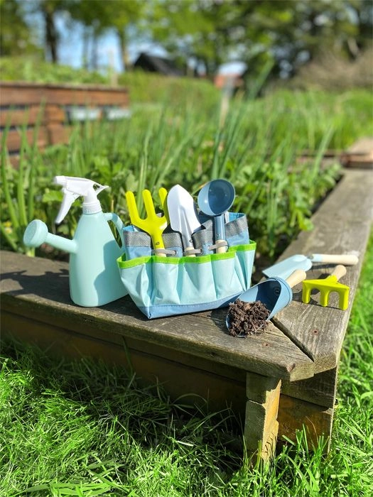 Lengvas ir nešiojamas krepšys suteikia pakankamai vietos, elastingus įrankių laikiklius ir patogų nešimą. Rinkinys pritaikytas vaikų rankoms, todėl darbas sode, prie aukštų lysvių ar smėlio dėžėje yra natūralus ir smagus. Patvarios medžiagos atlaiko kasdienį naudojimą ir įvairius paviršius.